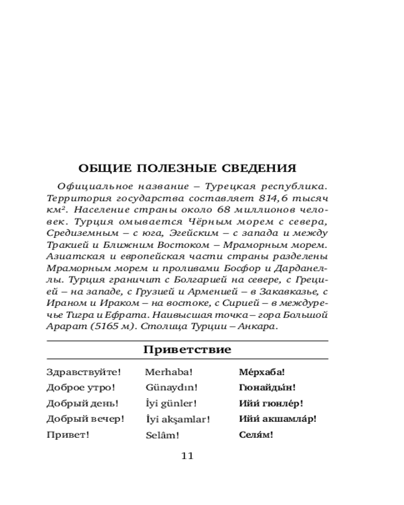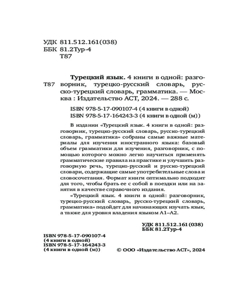 Серия: 4 книги в одной (м) В издании «Турецкий язык. 4 книги в одной: разговорник, турецко-русский словарь, русско-турецкий словарь, грамматика» собраны самые важные материалы для изучения иностранного языка: базовый объем грамматики для изучения, разговорник, с помощью которого можно легко научиться применять грамматические правила на практике и улучшить разговорную речь, турецко-русский и русско-турецкий словари, содержащие самые употребительные слова и словосочетания. Формат книги оптимально подходит для того, чтобы брать ее с собой в поездки или на занятия в качестве справочного издания. |