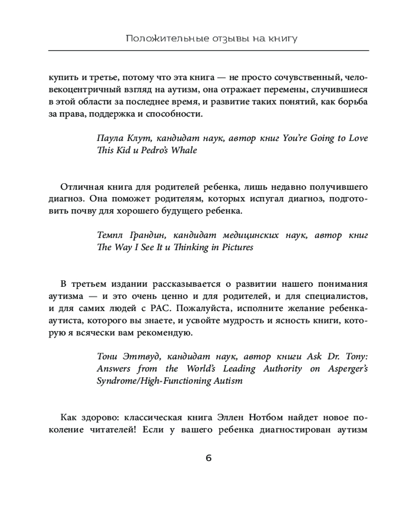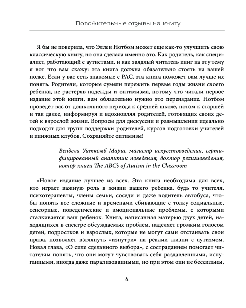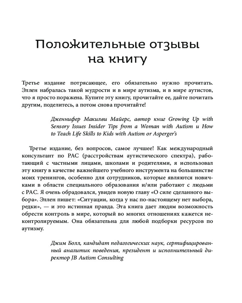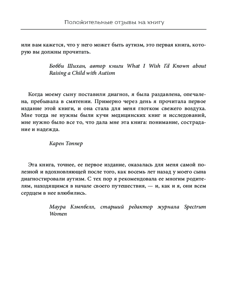 Эта книга сможет говорить за вас и вашего ребенка с теми, кто должен услышать ваше послание: учителями, родителями, братьями и сестрами, родственниками супруга, нянями, тренерами, водителями автобусов, родителями ровесников, друзьями братьев и сестер, соседями. Она вооружит базовыми знаниями об основных аспектах аутизма тех, кто окружает вашего ребенка. Это понимание сильно укрепит способность вашего ребенка вырасти в независимого и продуктивного взрослого.