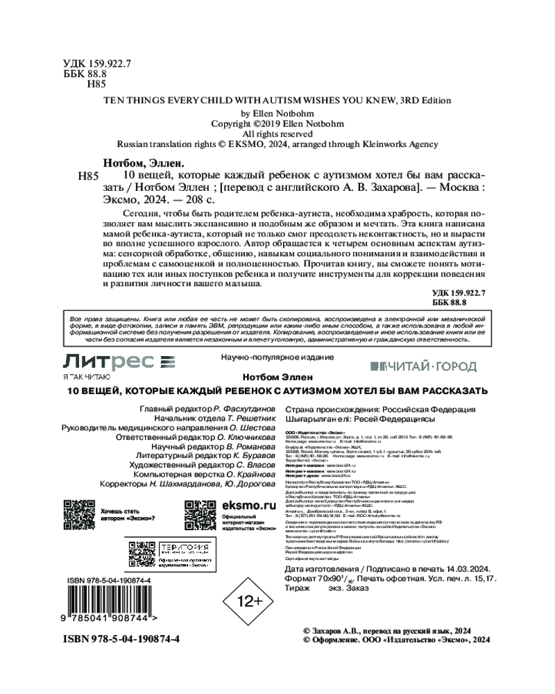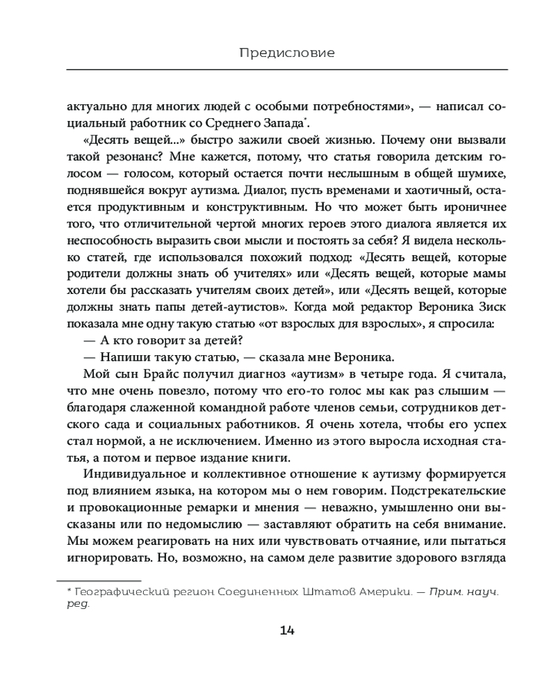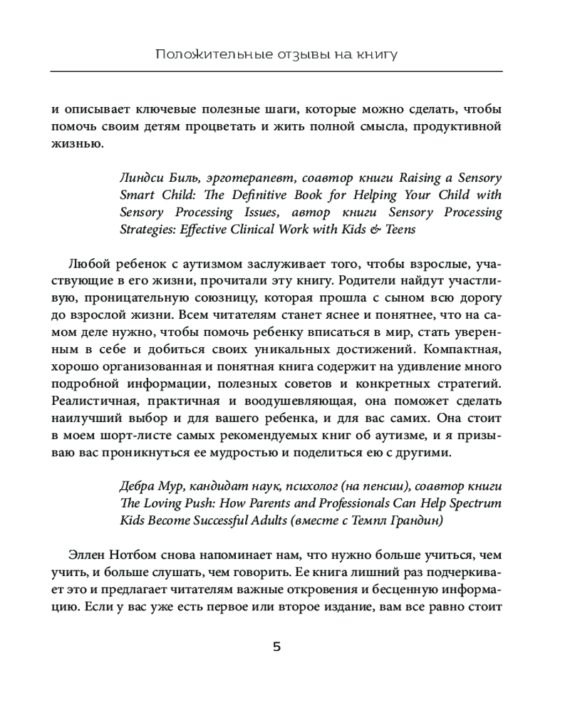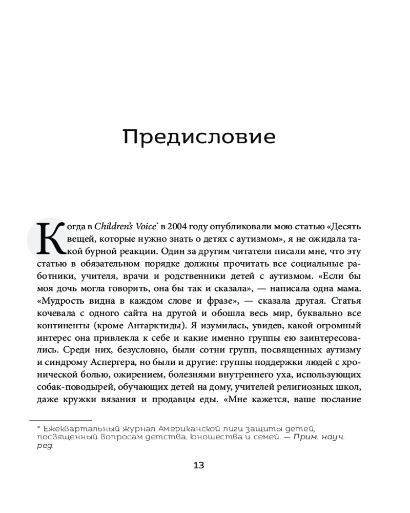 Эта книга сможет говорить за вас и вашего ребенка с теми, кто должен услышать ваше послание: учителями, родителями, братьями и сестрами, родственниками супруга, нянями, тренерами, водителями автобусов, родителями ровесников, друзьями братьев и сестер, соседями. Она вооружит базовыми знаниями об основных аспектах аутизма тех, кто окружает вашего ребенка. Это понимание сильно укрепит способность вашего ребенка вырасти в независимого и продуктивного взрослого.