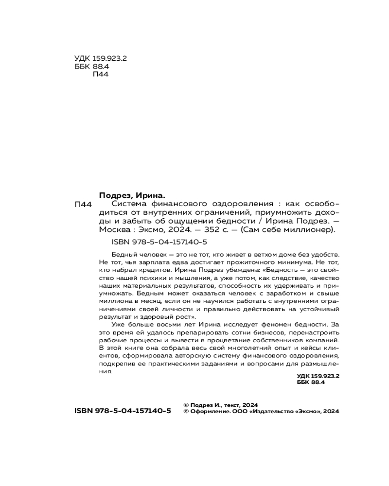💳 Оплатить за товар можно при получении 🇰🇿 Есть бесплатная доставка по Казахстану от 1 дня 🎁 Копите бонусы с каждой покупки Серия: Сам себе миллионер Бедный человек — это не тот, кто живет в ветхом доме без удобств. Не тот, чья зарплата едва достигает прожиточного минимума. Не тот, кто набрал кредитов. Ирина Подрез убеждена: «Бедность — это свойство нашей психики и мышления, а уже потом, как следствие, качество наших материальных результатов, способность их удерживать и преумножать. Бедным может оказаться человек с заработком и свыше миллиона в месяц, если он не научился работать с внутренними ограничениями своей личности и правильно действовать на устойчивый результат и здоровый рост». Уже больше восьми лет Ирина исследует феномен бедности. За это время ей удалось препарировать сотни бизнесов, перенастроить рабочие процессы и вывести в процветание собственников компаний. В этой книге она собрала весь свой многолетний опыт и кейсы клиентов, сформировала авторскую систему финансового оздоровления, подкрепив ее практическими заданиями и вопросами для размышления. |