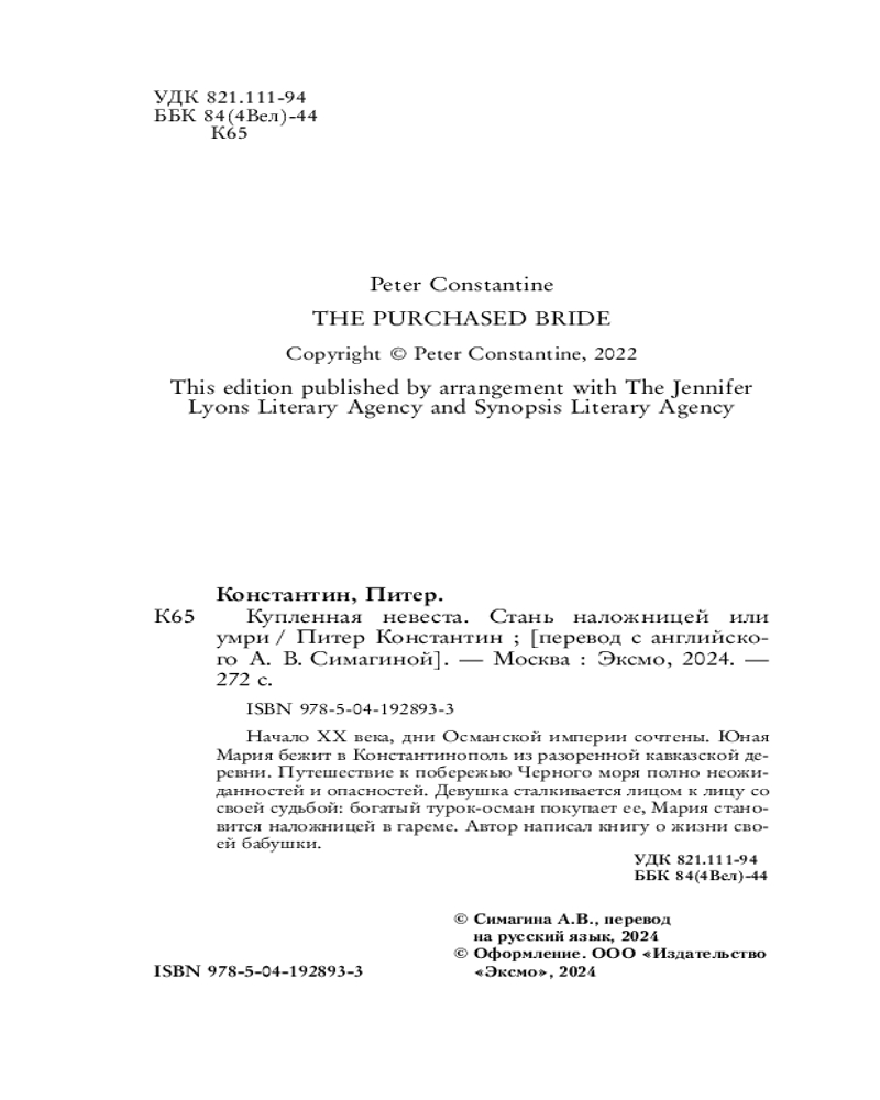 💳 Оплатить за товар можно при получении 🇰🇿 Есть бесплатная доставка по Казахстану от 1 дня 🎁 Копите бонусы с каждой покупки Серия: Замок из стекла. Книги о сильных людях и удивительных судьбах Автор написал книгу о жизни своей бабушки Марии. Она бежала с Кавказа в Константинополь. Вскоре ее продали богатому турку-осману в гарем. История невероятно сильной героини. Увлекательные подробности из жизни наложниц, правила гарема, интересные детали быта Турции и Кавказа 100 лет назад. Книга об эскалации насилия на Кавказе и конце Османской империи. |