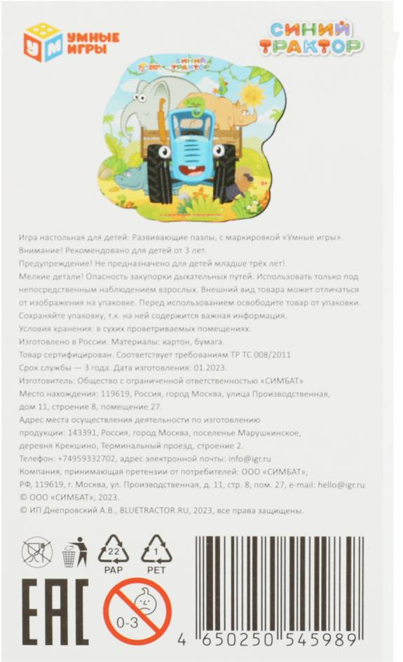 💳 Оплатить за товар можно при получении 🇰🇿 Есть бесплатная доставка по Казахстану от 1 дня 🎁 Копите бонусы с каждой покупки Серия: Синий трактор Фигурный пазл в рамке «Синий Трактор в Африке» ТМ «Умные игры» непременно понравится маленькому любознайке.Задача ребёнка – в правильной последовательности соединить пазлы друг с другом и получить в результате готовую картину с изображением персонажей любимого мультсериала. Благодаря небольшому количеству деталей и рамке с подсказками, малыш без труда сможет выполнить задание, с каждым разом делая это всё лучше и быстрее. |