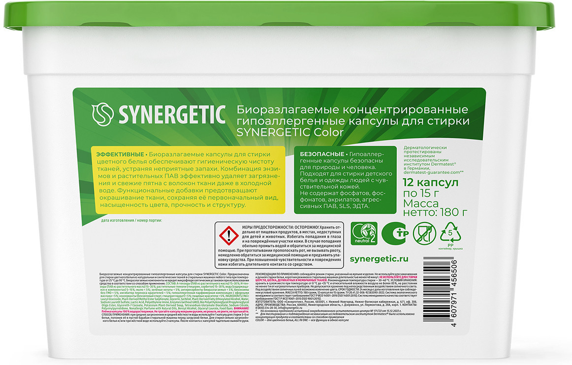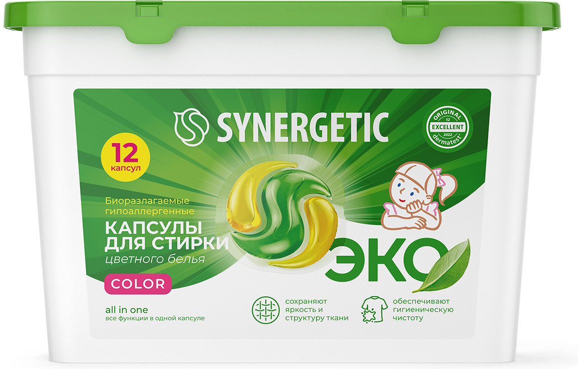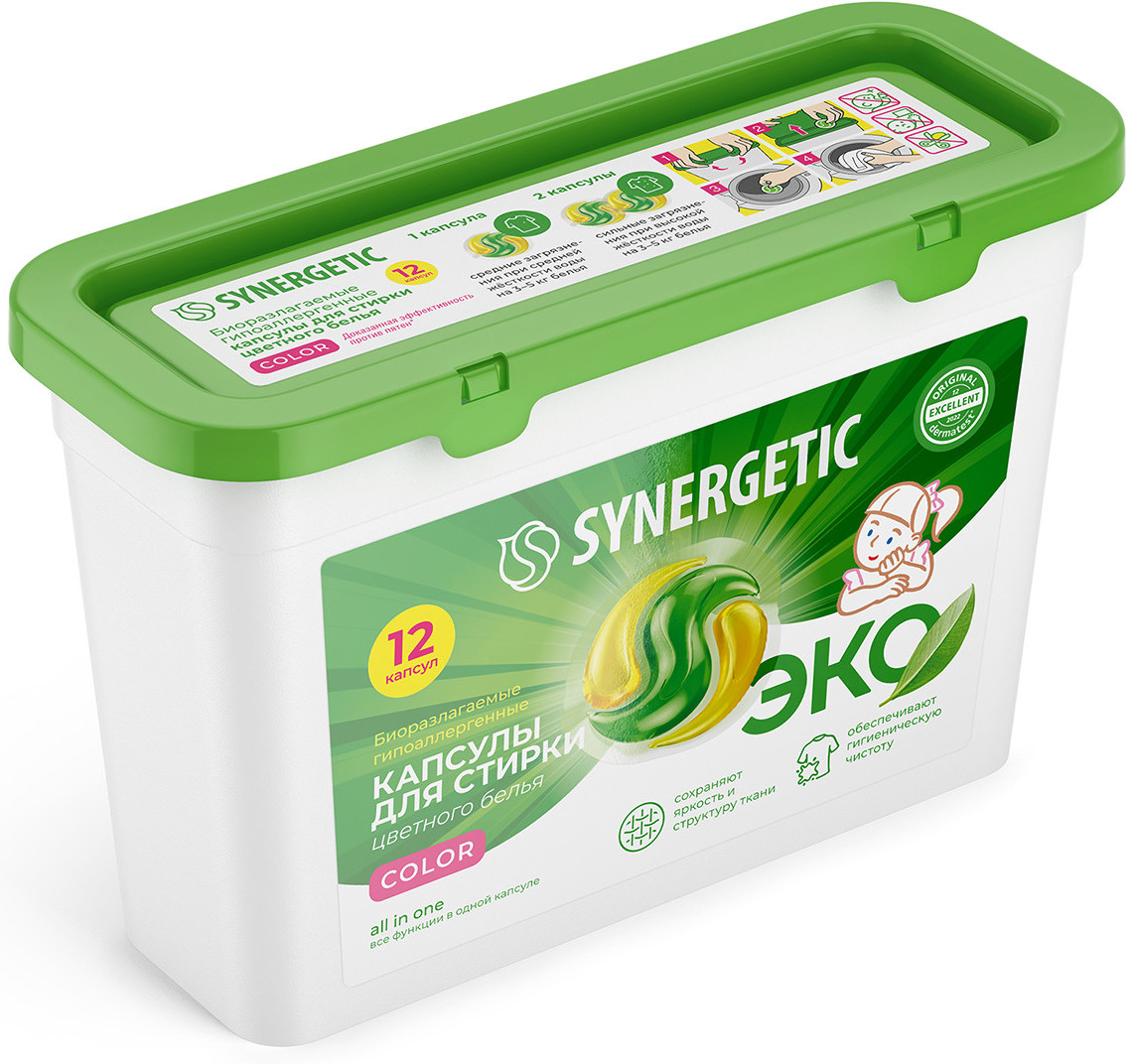 Биоразлагаемые капсулы для стирки цветного белья Synergetic «Color» обеспечивают гигиеническую чистоту, проникая глубоко в волокна ткани и расщепляя самые сложные загрязнения. Препятствуют появлению катышков и ворсинок, а также устраняют неприятные запахи. Комбинация энзимов и растительных ПАВ эффективно удаляет загрязнения и свежие пятна с волокон ткани даже в холодной воде. Функциональные добавки предотвращают окрашивание ткани, сохраняя её первоначальный вид, насыщенность цвета, прочность и структуру.