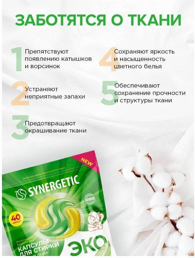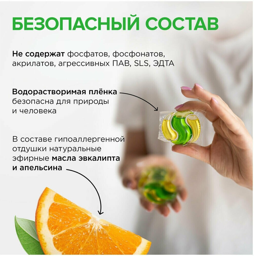 А-тензиды (ПАВ из растительного масла) 15–30%; Н-тензиды (ПАВ из растительного масла) 15–30%; растительные гликоли (глицерин, сорбитол) 15–30%; вода (содержащаяся в компонентах) ≤ 10%; мыло (калийные соли растительных кислот: олеат, лаурат, кокоат калия) < 5%; зелёные хелаты (ГЛДА, цитрат натрия) < 5%; антиресорбенты биоразлагаемые (этоксилированный полиамин, полиэфир) < 5%; энзимы без ГМО (смесь протеазы, амилазы, липазы, маннаназы, пектиназы, целлюлаз, фосфодиэстеразы) < 5%; ингибитор переноса красителей (винилпирролидон) < 5%; гипоаллергенная парфюмерная композиция с эфирными маслами эвкалипта и апельсина < 5%; консерванты (бензиловый спирт, глицерил лаурат) < 5%; пищевые красители < 5%.