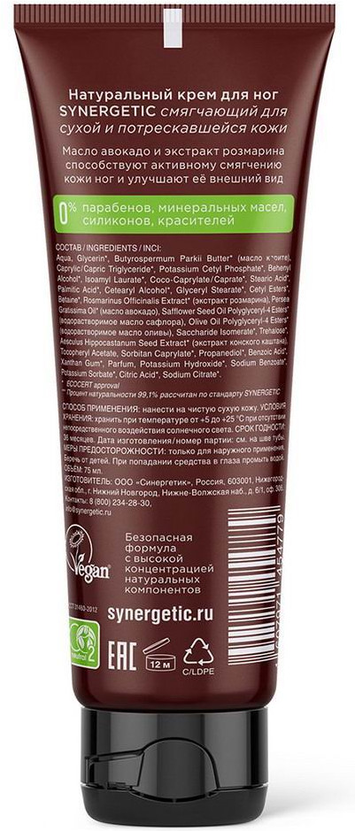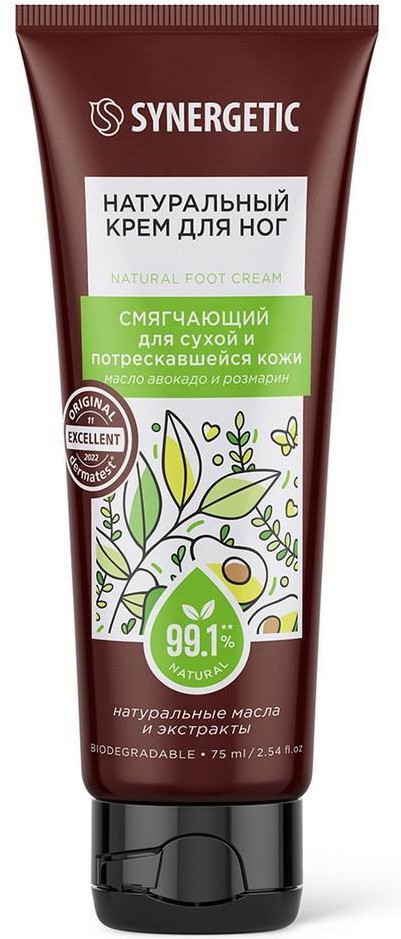 Synergetic Крем для ног смягчающий «Масло авокадо и розмарин»