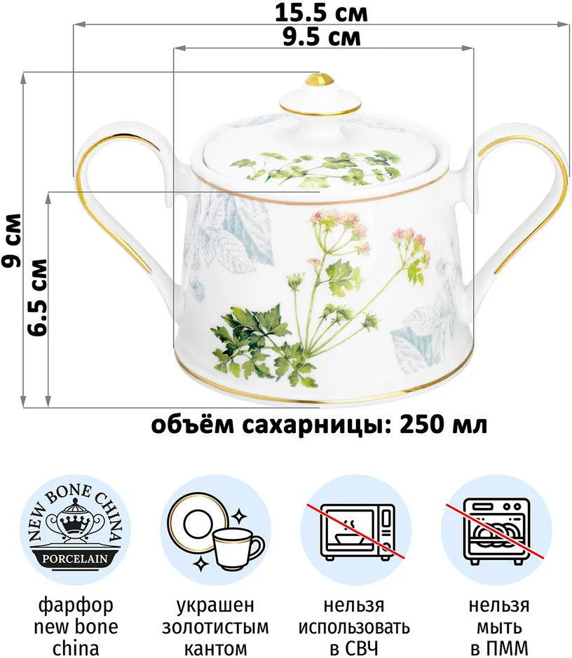 💳 Оплатить за товар можно при получении 🇰🇿 Есть бесплатная доставка по Казахстану от 1 дня 🎁 Копите бонусы с каждой покупки Серия: Juliette Сахарница Elan Gallery «Juliette» станет украшением вашей кухни. «Juliette» — это коллекция посуды из высококачественного фарфора new bone china с изящным цветочным рисунком и золотым окаймлением. Серия вдохновлена атмосферой очарования французской провинции и переносит нас в загадочный сад. Ёмкость подойдёт для хранения сахара, а также других продуктов, таких как варенье, мёд и даже икра. |