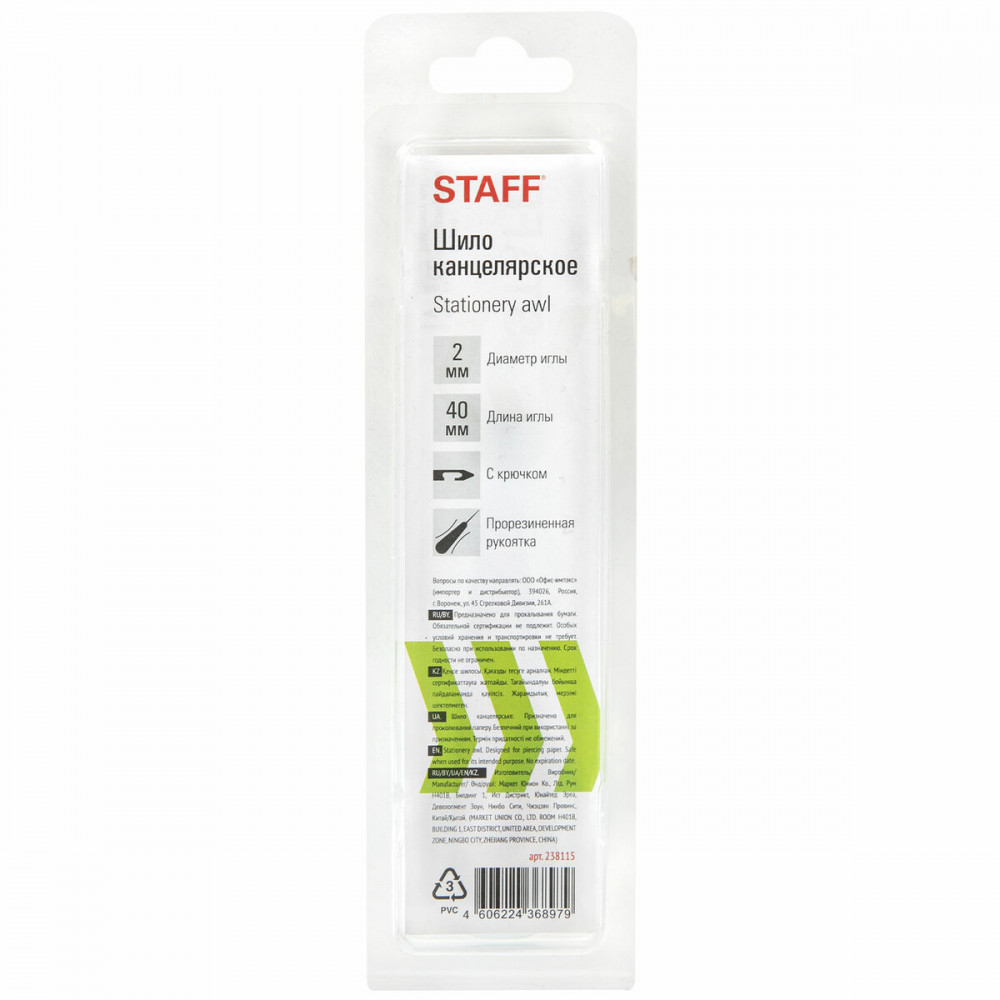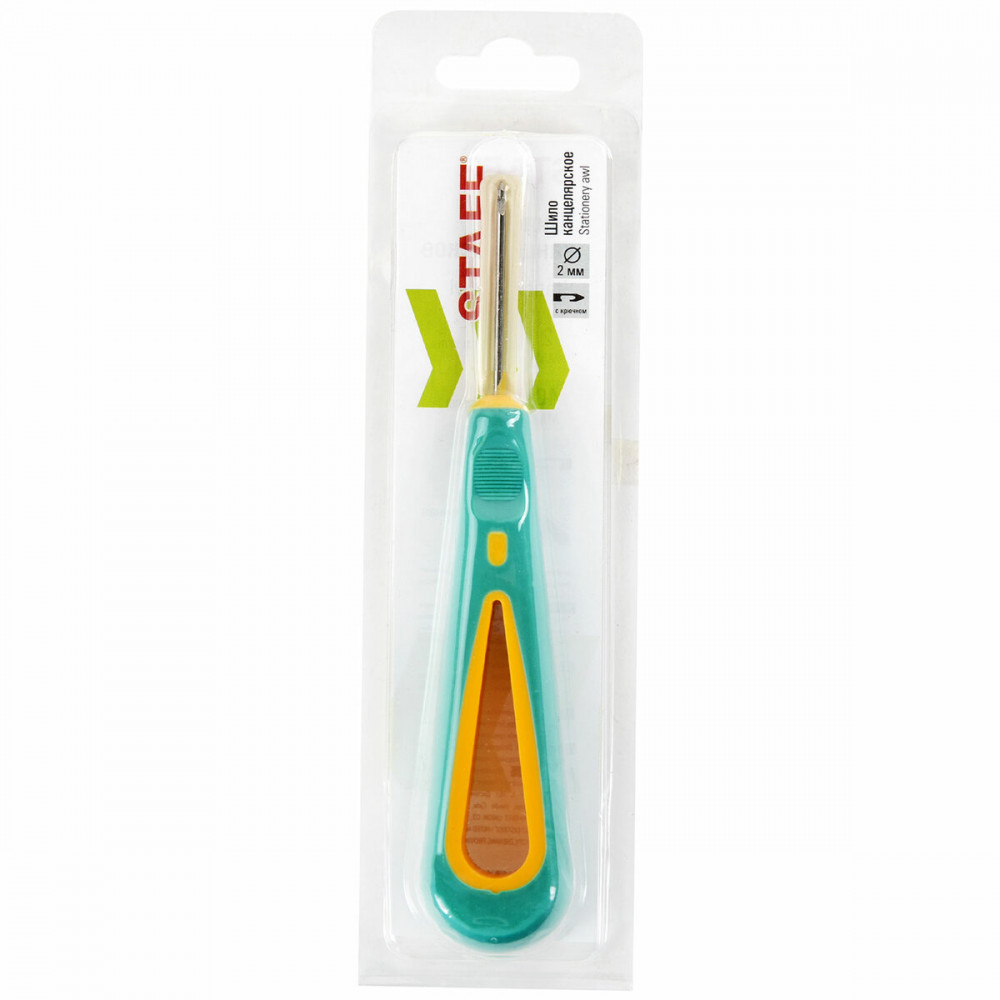 Канцелярское шило Staff предназначено для прошивки документов и прокалывания бумаги. Игла с крючком диаметром 2 мм и длиной 4 см из стали с пластиковой цветной рукояткой. Шило обеспечивает прокалывание до 30 листов бумаги. Поставляется в блистере с подвесом.