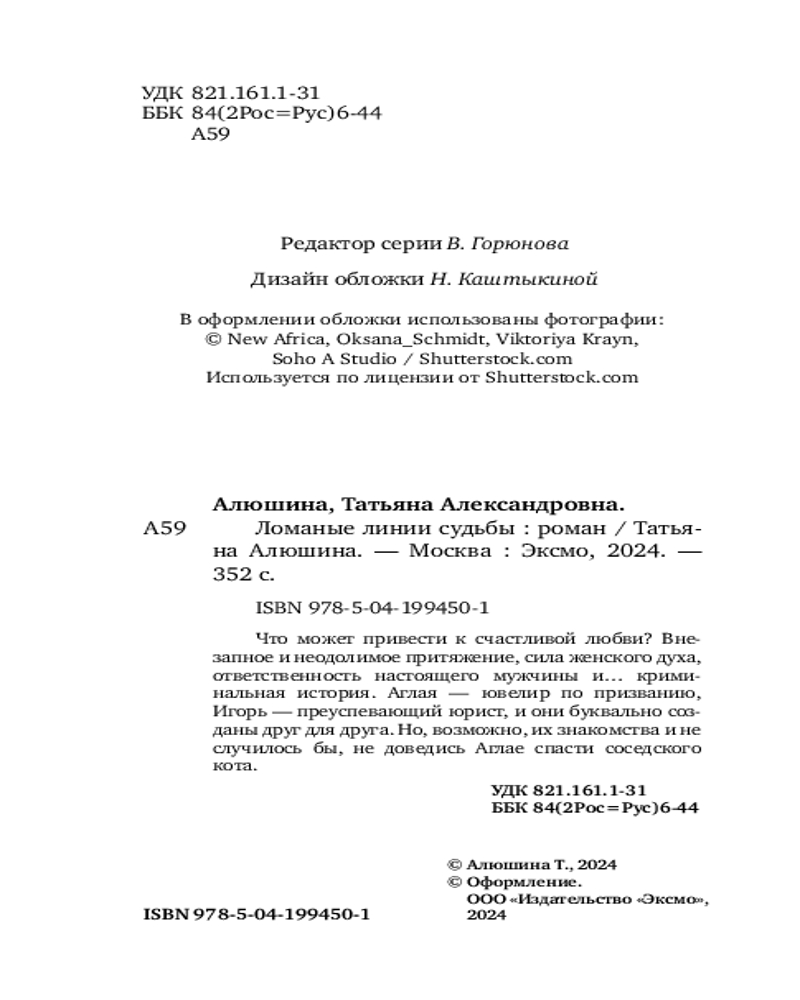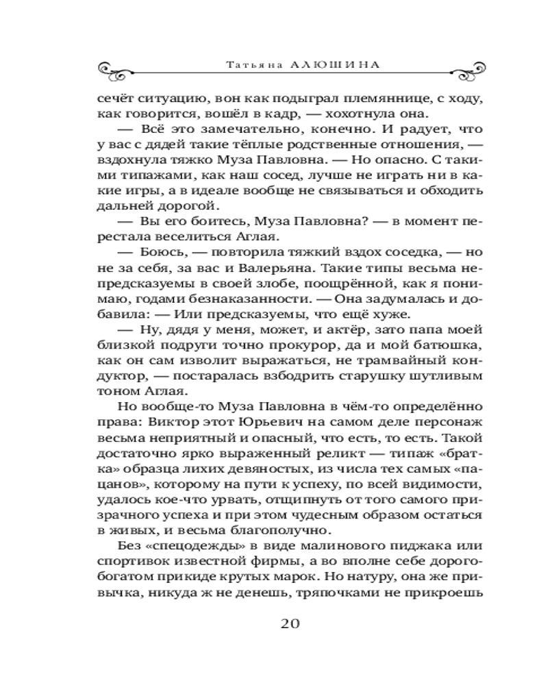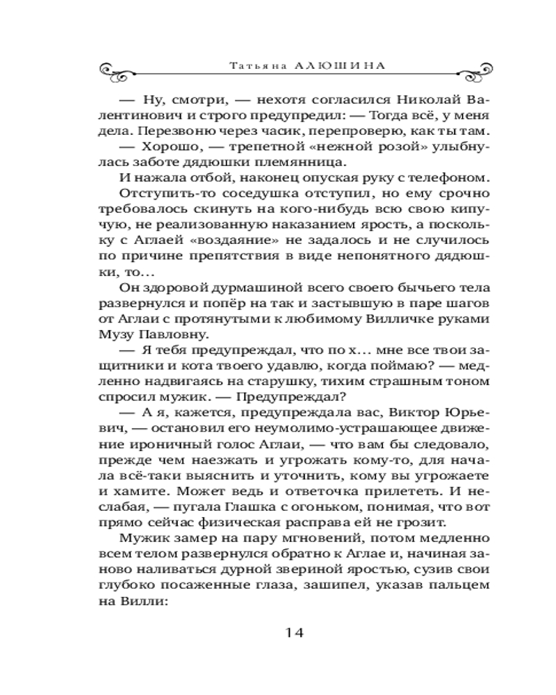 💳 Оплатить за товар можно при получении 🇰🇿 Есть бесплатная доставка по Казахстану от 1 дня 🎁 Копите бонусы с каждой покупки Серия: Еще раз про любовь. Романы Т. Алюшиной. Новое оформление (обложка) Иногда спасение соседского кота может привести к счастливому устройству личной жизни. Именно благодаря этому случаю Аглая Зорина, девушка с потрясающей силой духа и необычной профессией, попадает в детективную историю и встречает мужчину своей мечты. Изюминка книги в том, что кот возвращает своей спасительнице долг жизни. |