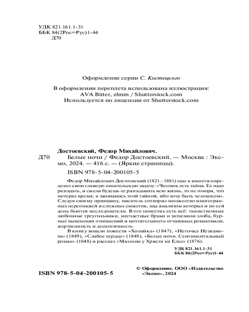 💳 Оплатить за товар можно при получении 🇰🇿 Есть бесплатная доставка по Казахстану от 1 дня 🎁 Копите бонусы с каждой покупки Серия: Яркие страницы Федор Михайлович Достоевский (1821–1881) еще в юности определил свою главную писательскую задачу: «Человек есть тайна. Ее надо разгадать, и ежели будешь ее разгадывать всю жизнь, то не говори, что потерял время; я занимаюсь этой тайной, ибо хочу быть человеком». Следуя своему принципу, писатель сотворил множество многогранных персонажей и сложных сюжетов, над анализом которых и по сей день бьются исследователи. В его повестях есть всё: таинственные любовные треугольники, несчастные браки и затаенная злоба, бурные выяснения отношений и мечтательность отчаянных романтиков, жертвенность и деспотичность. В книгу вошли повести «Хозяйка» (1847), «Неточка Незванова» (1849), «Слабое сердце» (1848), «Белые ночи. Сентиментальный роман» (1848) и рассказ «Мальчик у Христа на Елке» (1876). |