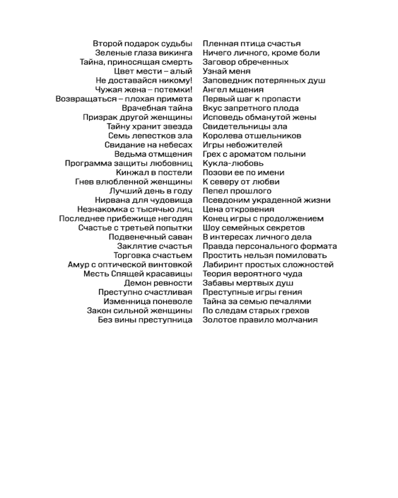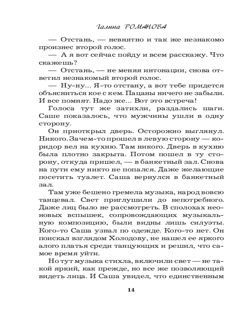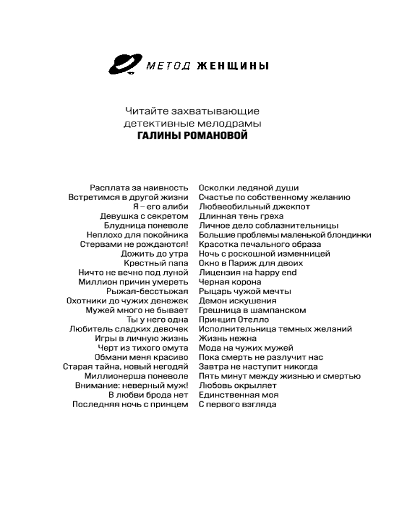 Галина Романова — подлинный знаток человеческих чувств и отношений. В ее детективных мелодрамах из серии «Метод женщины» переплетаются и кровь, и слезы, и любовь. Все, как в реальности, когда один-единственный шаг отделяет нас от любви до ненависти, от дружбы до любви, от рождения до смерти. Нежные чувства проверяются настоящими испытаниями, где награда — сама жизнь. |