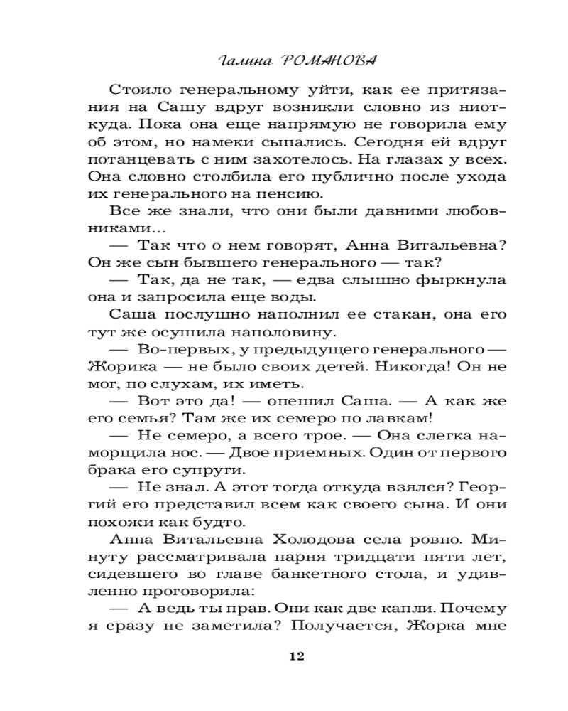 Сегодня Галина Романова работает в филиале крупной производственной корпорации, и её коллеги не подозревают, что становятся прообразами героев мелодраматических детективов, которыми зачитываются далеко за пределами Липецкой области. |