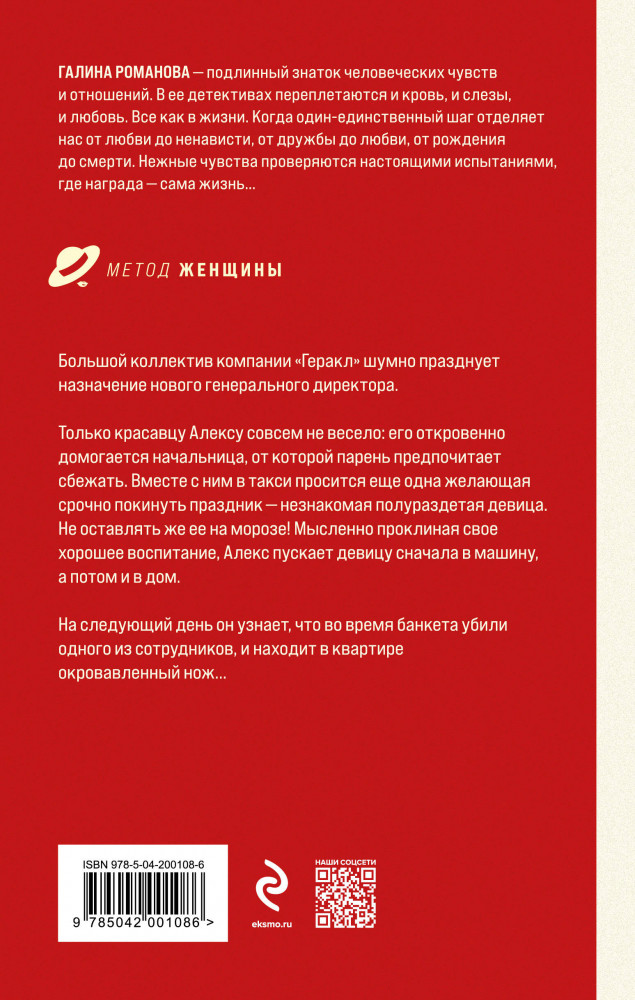 В данный момент этот товар отсутствует в продаже. Возможно, у нас найдется аналогичный или похожий товар здесь. Серия: Детективы Галины Романовой. Метод Женщины. Новое оформление Большой коллектив компании «Геракл» шумно празднует назначение нового генерального директора. Только красавцу Алексу совсем не весело: его откровенно домогается начальница, от которой парень предпочитает сбежать. Вместе с ним в такси просится еще одна желающая срочно покинуть праздник — незнакомая полураздетая девица. Не оставлять же ее на морозе! Мысленно проклиная свое хорошее воспитание, Алекс пускает девицу сначала в машину, а потом и в дом. На следующий день он узнает, что во время банкета убили одного из сотрудников, и находит в квартире окровавленный нож...
