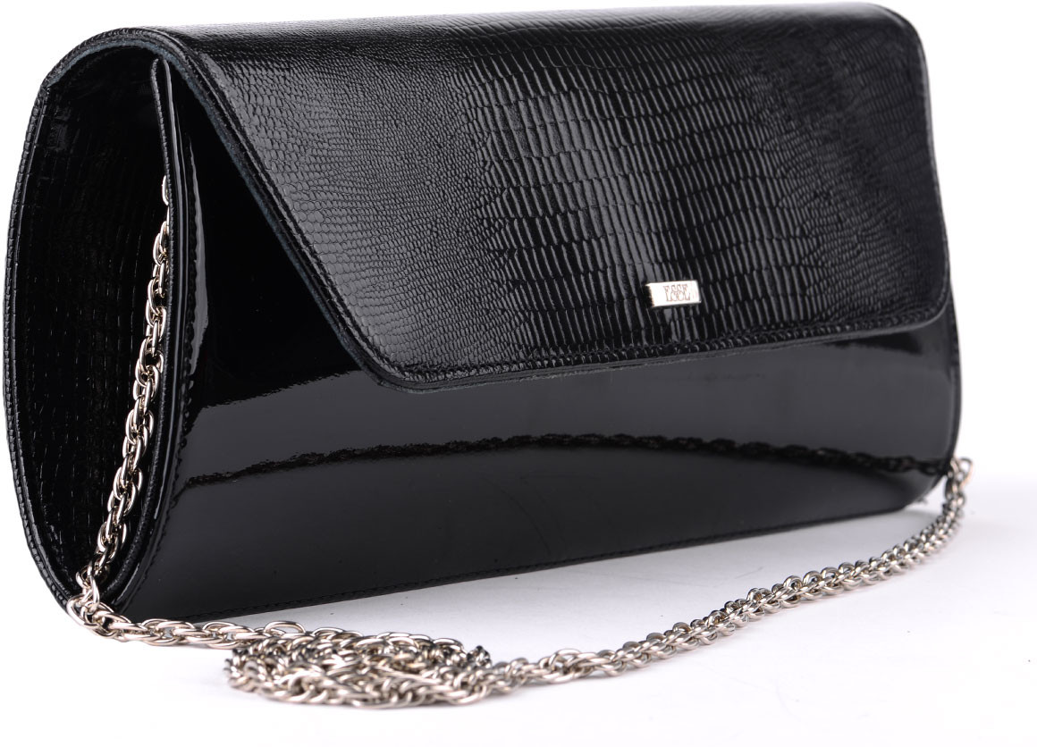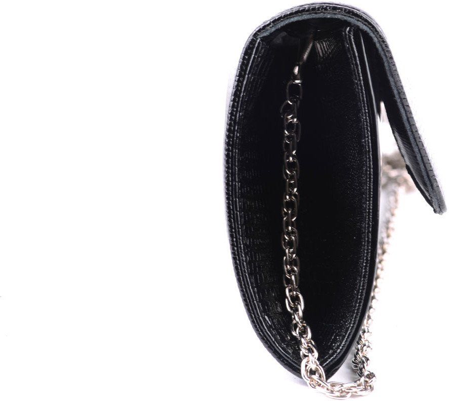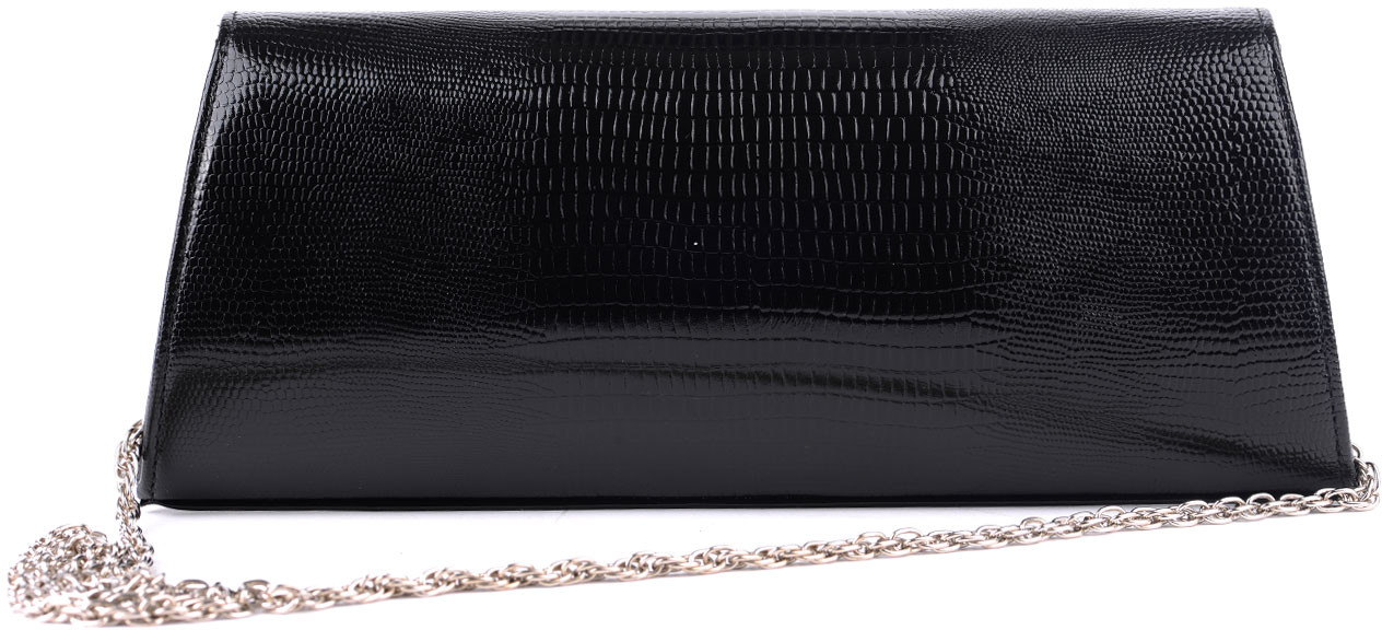 Классический клатч закрывается клапаном на кнопке. Внутри одно отделение и открытый карман для телефона. Клатч укомплектован съемной цепочкой.