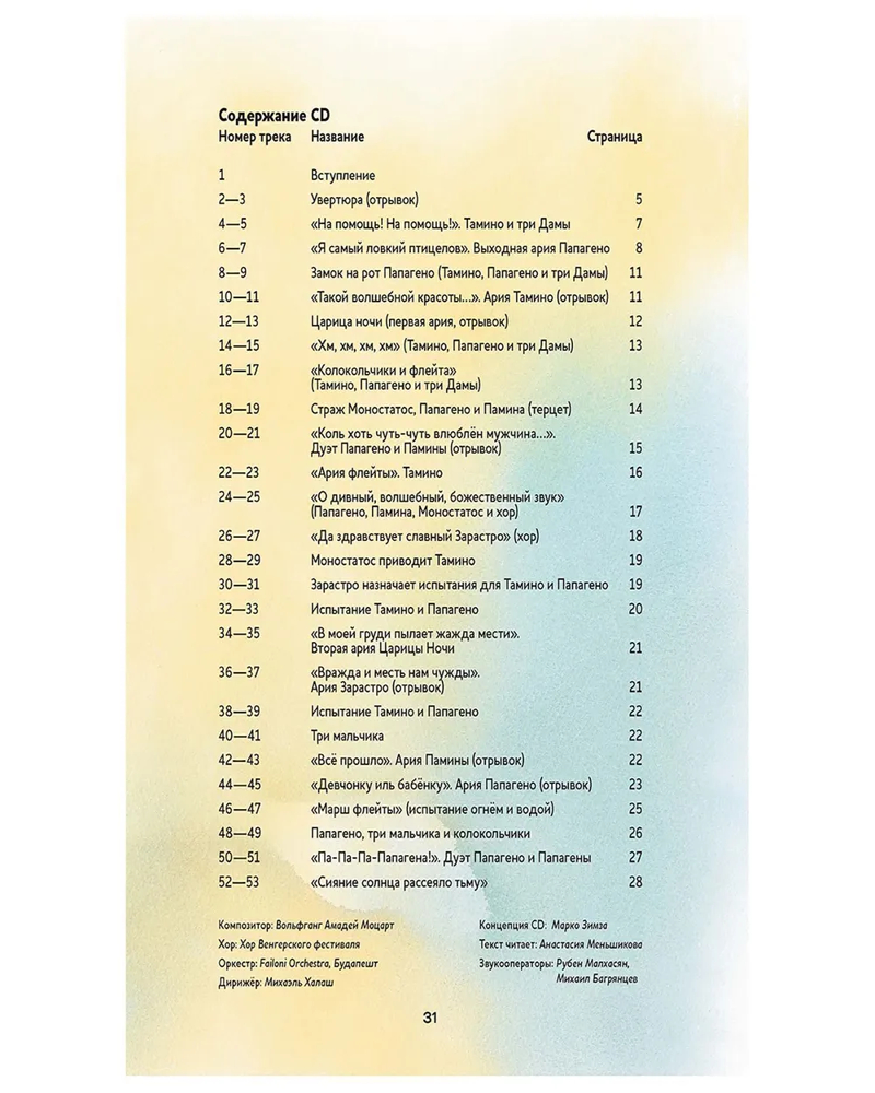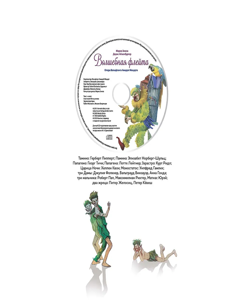 В данный момент этот товар отсутствует в продаже. Возможно, у нас найдется аналогичный или похожий товар здесь. Серия: Музыкальная классика для детей «Волшебная флейта» — опера величайшего австрийского композитора Вольфганга Амадея Моцарта, полная волшебства и чудес. Она рассказывает удивительную историю о забавном птицелове Папагено, влиятельной Царице ночи, добром волшебнике Зарастро и гордом принце Тамино, отправляющемся на поиски очаровательной Памины.