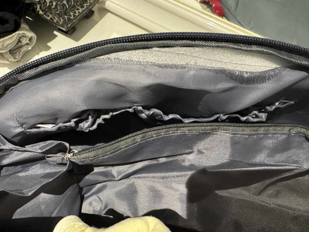 Некачественно прошит. Одна сторона поделала вообще не захвачена в шов. На фото не стала раздирать, чтобы показать что полностью отдельно подкладка от самого органайзера. Но это так