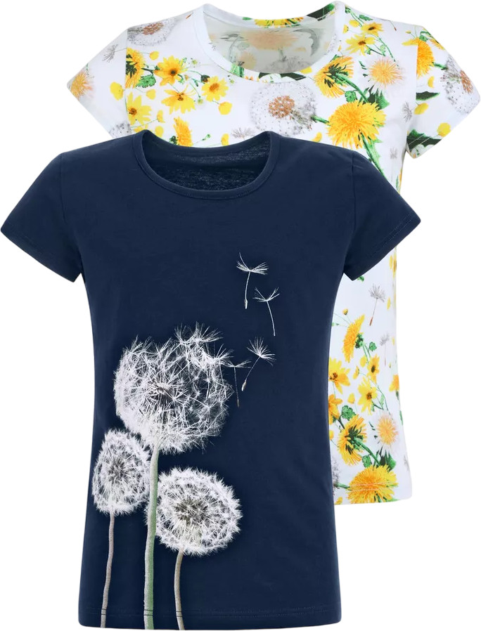 Комплект из двух футболок для девочки выполнен из кулира — легкого хлопкового полотна. Футболки облегающего силуэта с короткими рукавами, одна украшена нежным принтом, вторая дизайнерской набивкой.