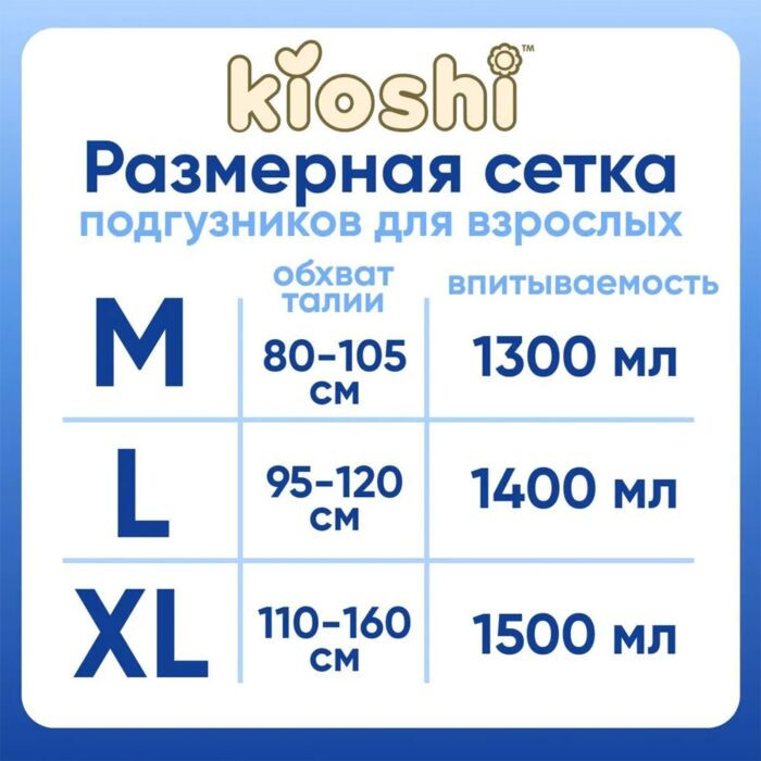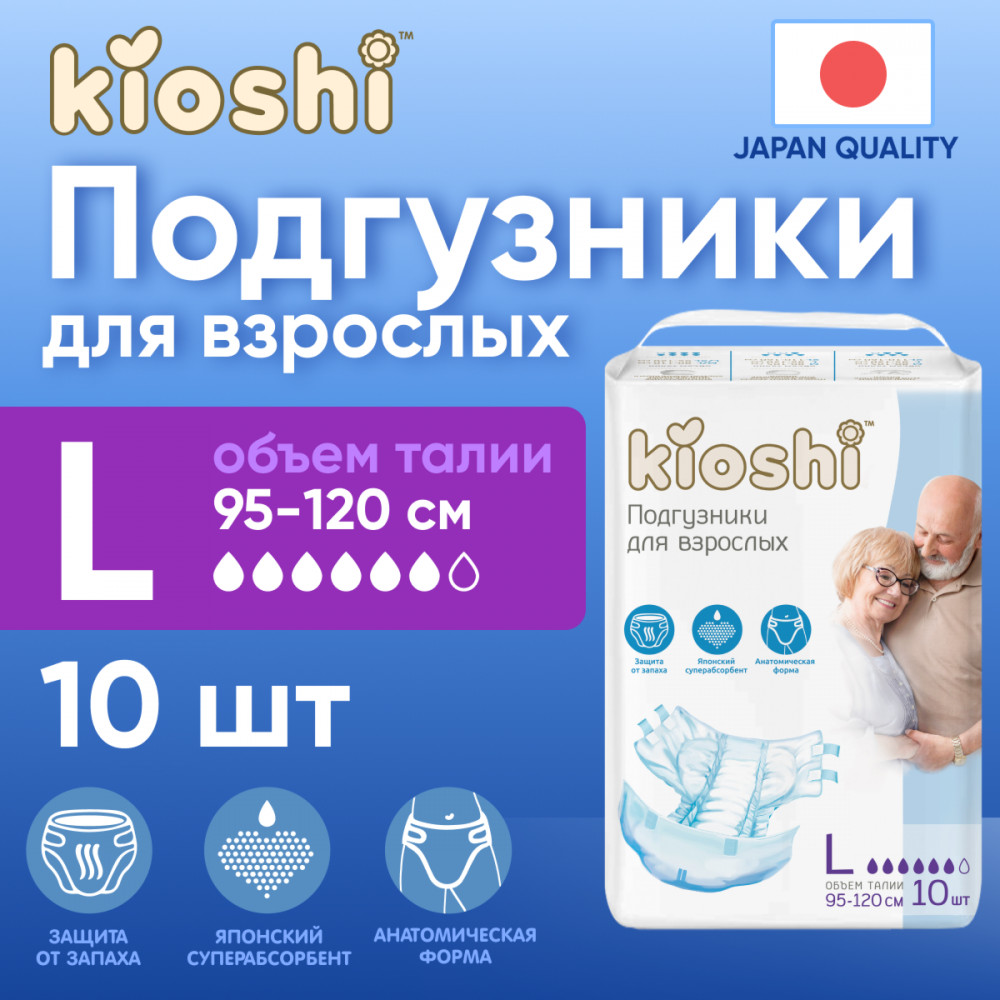 Подгузники для взрослых подойдут для людей, страдающих средней формой недержания, а также для лежачих больных. Подгузники в размере L, подходят людям с обхватом талии 95-120 см при этом они впитывают до 1400 мл жидкости. Благодаря бортикам-манжетам вокруг ног — подгузники эффективно защищают от протекания днем и ночью.