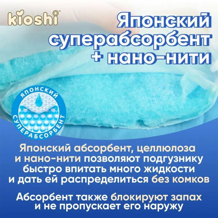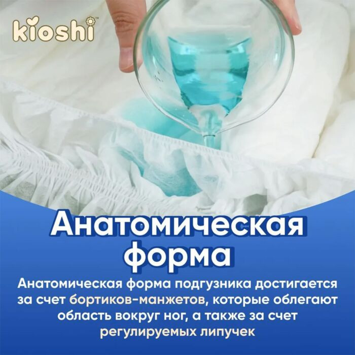 Анатомическая форма подгузника достигается за счет бортиков-манжетов, которые облегают область вокруг ног и четырех регулируемых липучек, которые можно закрепить на нужный вам размер. Подгузники для ухода за людьми с ограниченной подвижностью идеально впитывают за счет многоуровнего впитывающего слоя: первый слой состоит из целлюлозы, которая увеличивает объем впитываемой жидкости, второй слой состоит из абсорбента на нано-нитях, за счет чего влага быстро уходит с верхнего слоя и равномерно распределяется внутри без комков. Абсорбент блокируют запах и не пропускает его наружу. Внешний слой взрослого подгузника сделан из дышащего материала, что предотвращает появление опрелостей.