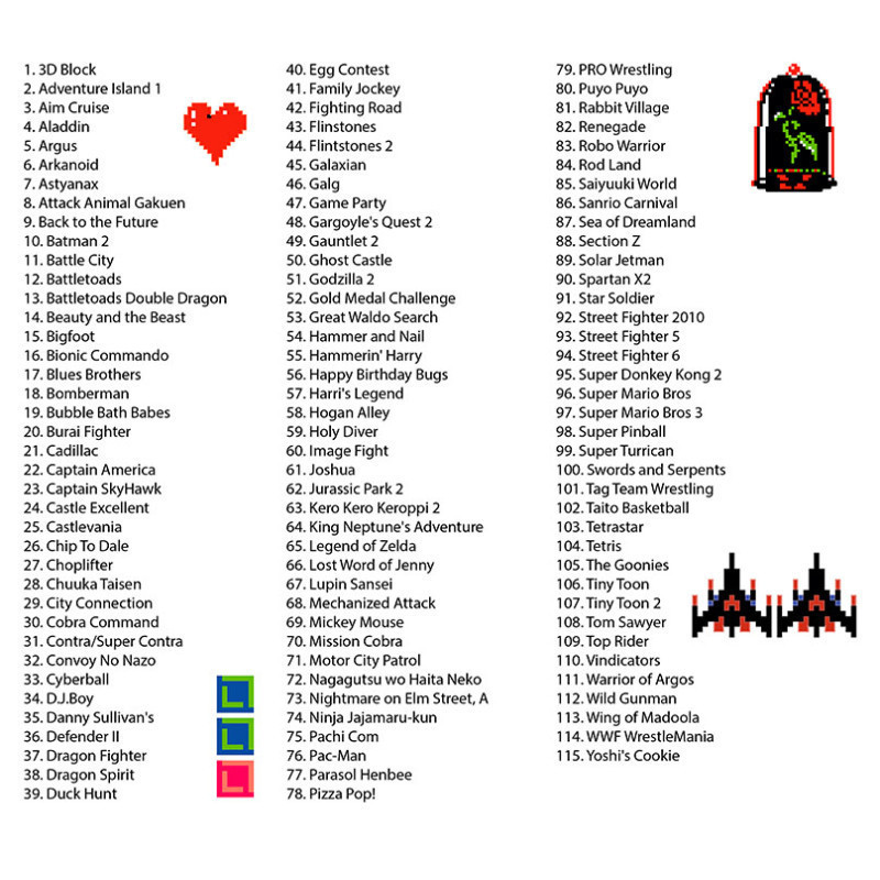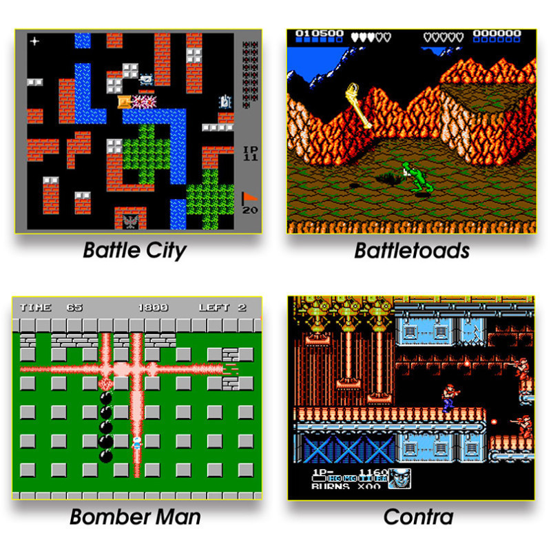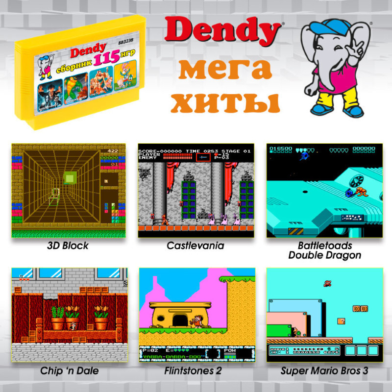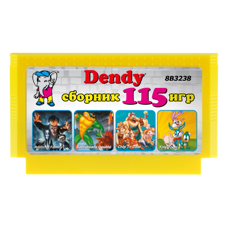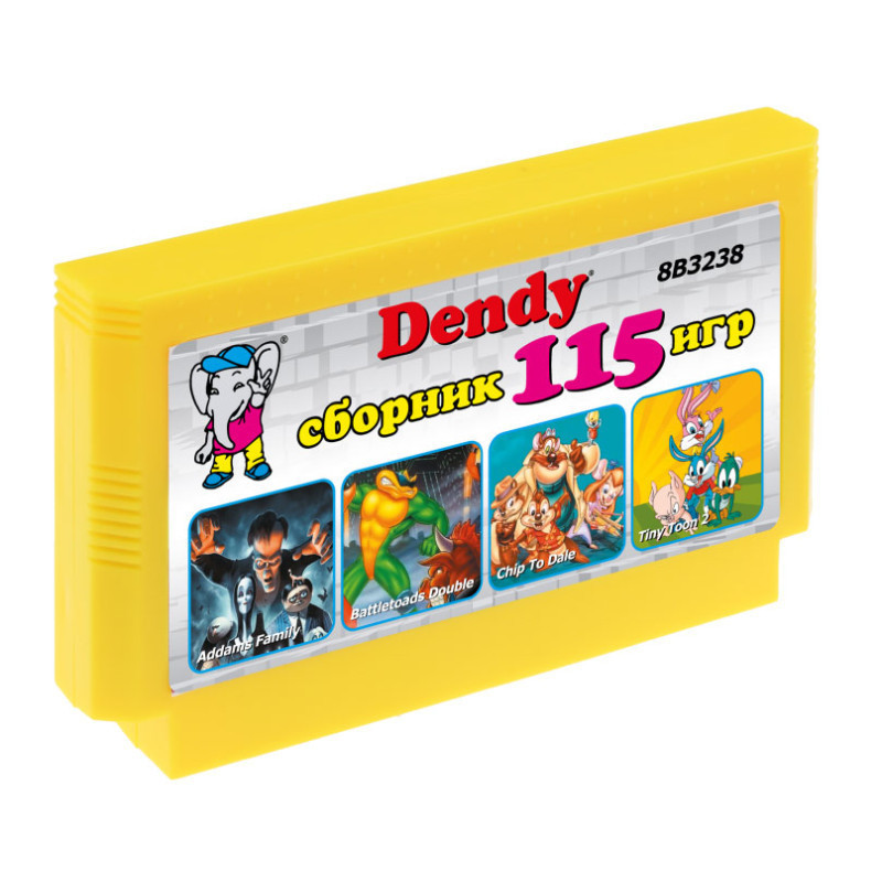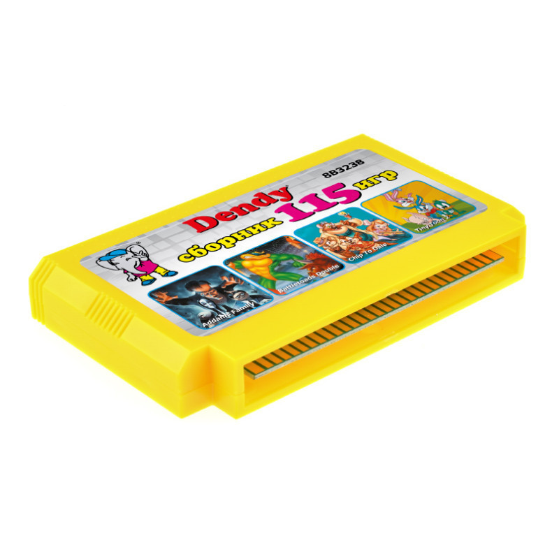 115 игр, в том числе с переводом на русский язык и 2 дополнительные версии Battletoads и Battletoads Double Dragon для всех типов приставок. В сборник включены игры на развитие логического мышления и скорости реакции, интересные платформеры с мультяшными героями, космические леталки-стрелялки, спортивные игры, файтинги, тетрисы и игры для пистолета. В сборник входят только полные версии, игры на одного и двух игроков. Игровой картридж совместим с игровыми видеоприставками 8-бит Денди (стандарт 8-bit) и аналогичными.