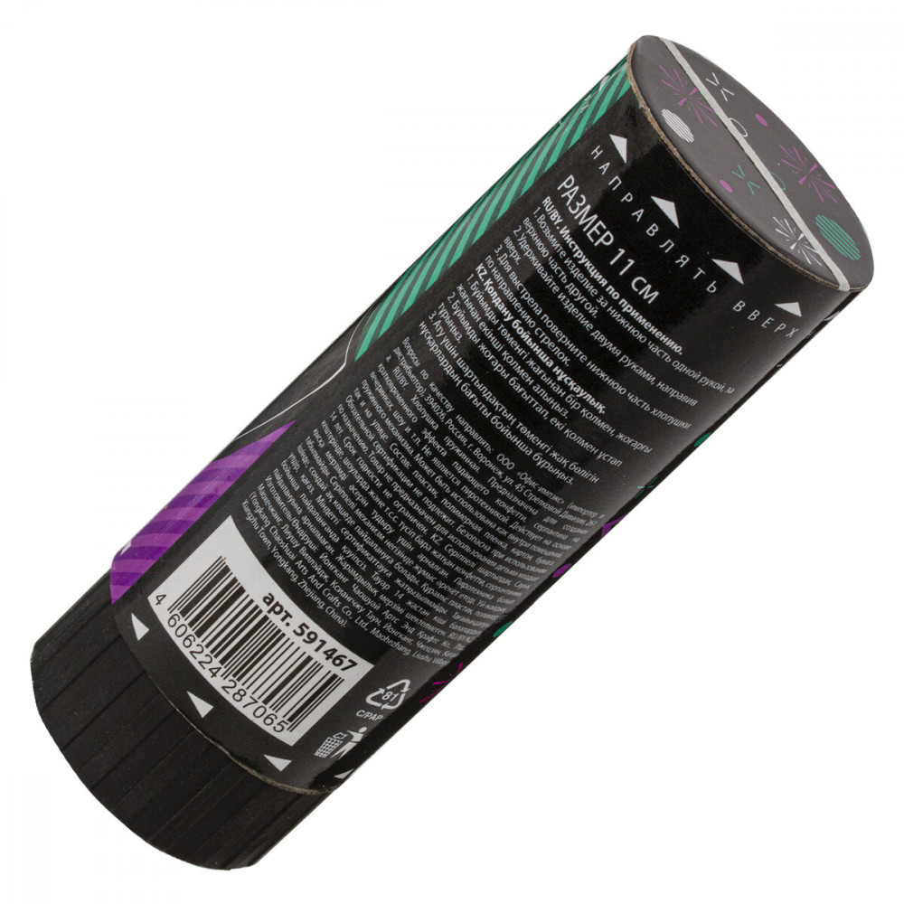 Хлопушка высотой 11 см с фольгированным наполнителем в виде серпантина и конфетти цвета ассорти является абсолютно безопасной, так как действует на основе пружинного механизма. Не является пиротехникой. Средняя дальность выстрела хлопушки с данным типом наполнения — 2 м. Хлопушка может быть использована как внутри помещений, так и на улице.