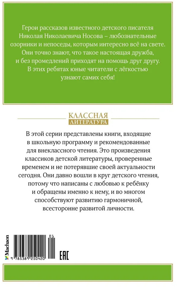 💳 Оплатить за товар можно при получении 🇰🇿 Есть бесплатная доставка по Казахстану от 1 дня 🎁 Копите бонусы с каждой покупки Серия: Классная литература Герои рассказов известного детского писателя Николая Николаевича Носова — любознательные озорники и непоседы, которым интересно всё на свете. Они точно знают, что такое настоящая дружба, и без промедлений приходят на помощь друг другу. В этих ребятах юные читатели с лёгкостью узнают самих себя! |