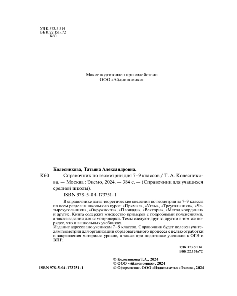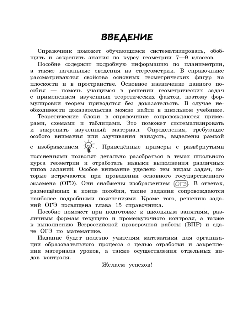 Справочник по геометрии для 7-9 классовТатьяна Александровна Колесникова В данный момент этот товар отсутствует в продаже. Возможно, у нас найдется аналогичный или похожий товар здесь. Серия: Справочник для учащихся средней школы Справочник по геометрии поможет школьникам 7-9 классов не только подготовиться к урокам, но и понять этот сложный предмет! Основываясь на богатом опыте преподавания и подготовки к экзаменам, автор систематизировал обширные теоретические сведения по основным геометрическим разделам и изложил их простым и доступным языком. Книга содержит множество поясняющих рисунков: так изучать предмет намного проще и эффективнее. Таблицы помогут систематизировать и лучше усвоить информацию, а примеры решения задач с разборами и задания для самопроверки закрепить изученное. Справочник соответствует школьной программе по геометрии для 7-9 классов. В конце пособия приводятся ответы ко всем заданиям. С этой книгой геометрия станет понятной даже тем, кто всегда с трудом ориентировался в геометрических построениях! Благодаря интегральному переплету справочник школьника прослужит долгие годы. |