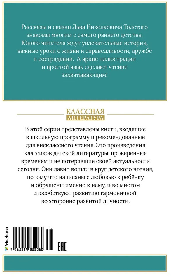 💳 Оплатить за товар можно при получении 🇰🇿 Есть бесплатная доставка по Казахстану 🎁 Копите бонусы с каждой покупки Серия: Классная литература Рассказы и сказки Льва Николаевича Толстого знакомы многим с самого раннего детства. Юного читателя ждут увлекательные истории, важные уроки о жизни и справедливости, дружбе и сострадании. А яркие иллюстрации и простой язык сделают чтение захватывающим! |