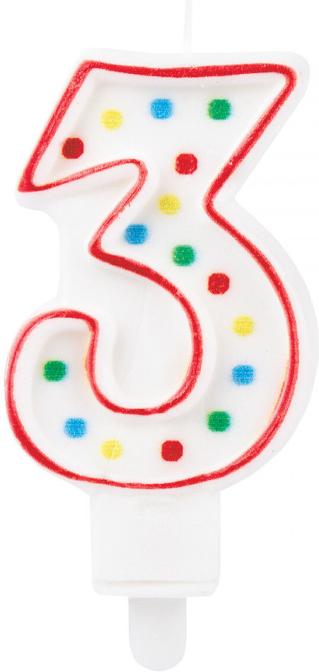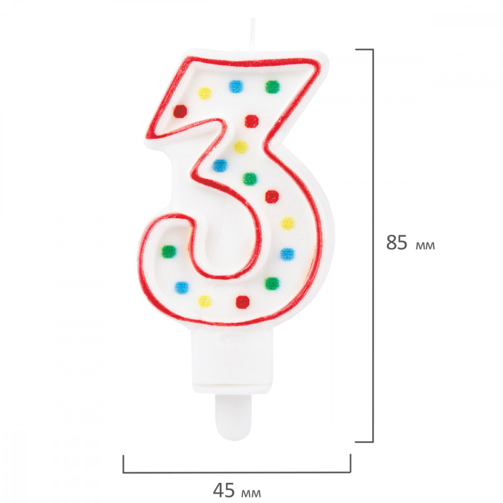 Двусторонняя свеча с рисунком в виде конфетти представляет собой цифру «3». Свеча выполнена из парафина и укомплектована пластиковым держателем для удобства размещения цифры на торте или другом кондитерском изделии.