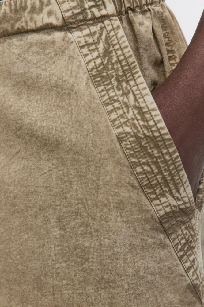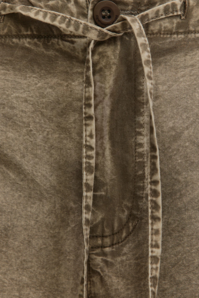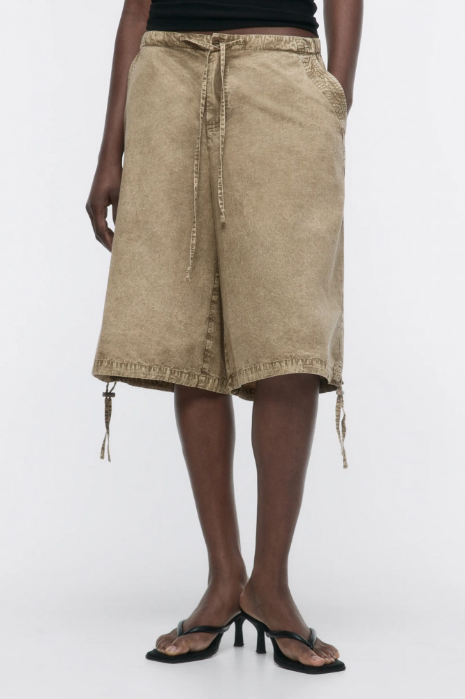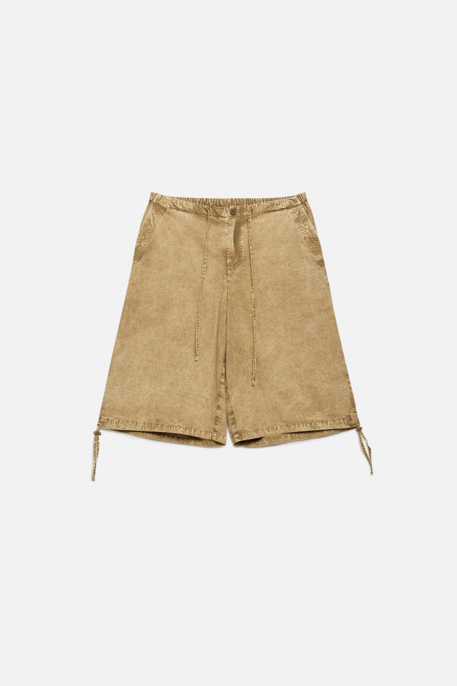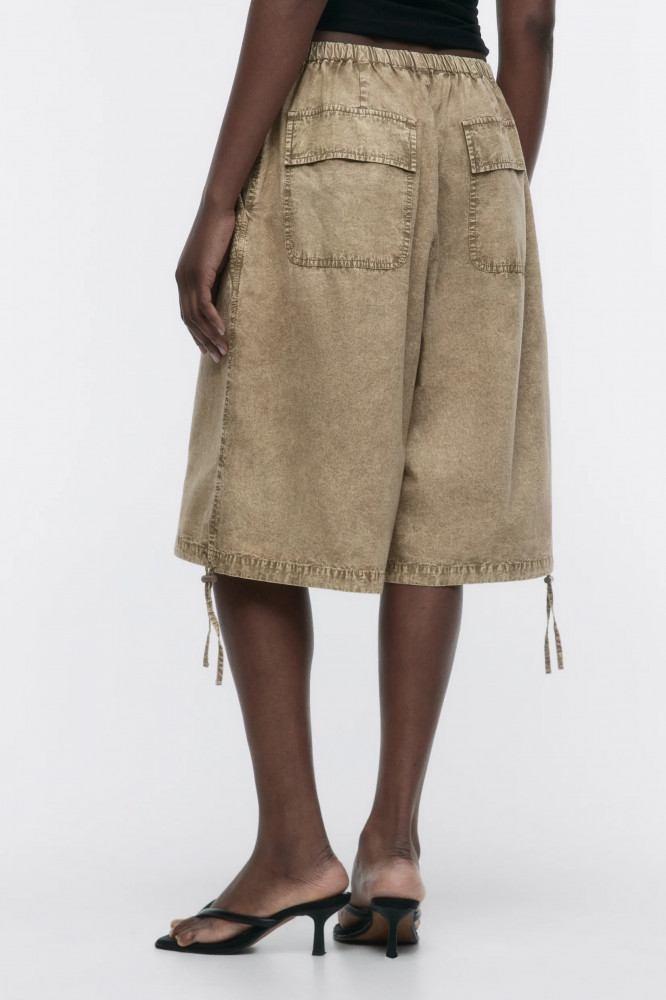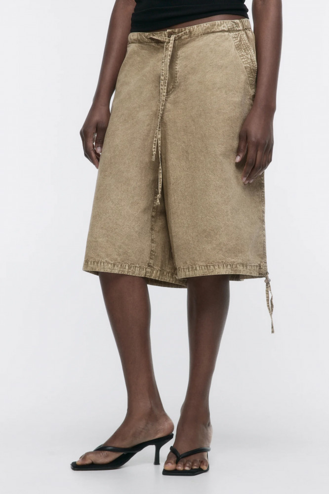 Длинные женские шорты-бриджи широкого кроя из легкой 100% хлопковой ткани с текстильной фактурой. Трендовая низкая посадка подчеркивает фигуру и акцентирует внимание на талии. Широкие штанины ниже колена с утяжками и стопперами по нижнему краю. Два боковых кармана с отрезным бочком, два накладных кармана с клапаном сзади. Застежка на молнию и пуговицу, эластичный пояс на завязках, который не натирает и не сковывает движения. Различные спокойные расцветки с трендовым вареным эффектом.