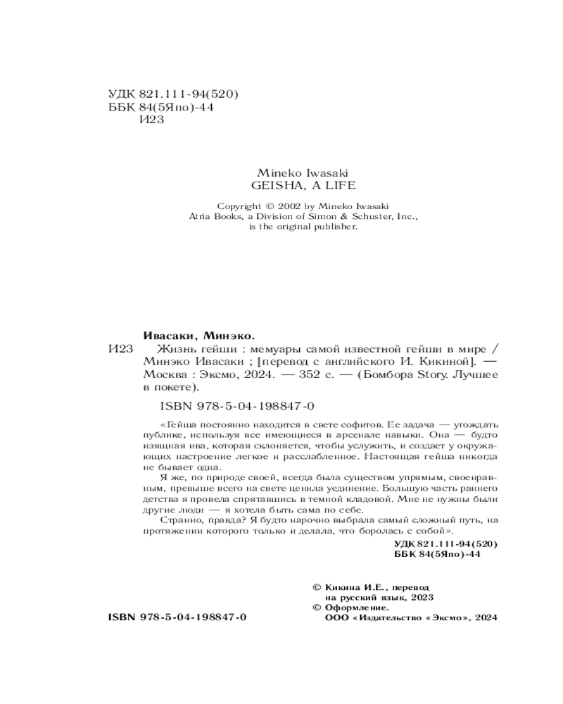 💳 Оплатить за товар можно при получении 🇰🇿 Есть бесплатная доставка по Казахстану от 1 дня 🎁 Копите бонусы с каждой покупки Серия: Бомбора Story. Лучшее в покете Жизнь Минэко Ивасаки была описана в бестселлере Артура Голдена «Мемуары гейши». По книге был снят одноименный фильм. Но Артур Голден допустил множество ошибок и неточностей, смешав, по мнению Минэко, искусство красоты с развратностью. И тогда она решила издать свои мемуары, где откровенно рассказала истинную правду о своей жизни. Обученная быть гейшей с пяти лет, Ивасаки жила среди других «женщин искусства», практиковала древние обычаи японских развлечений. Ей поклонялись короли, принцы, военные герои и государственные деятели. Женщина с удивительной судьбой, она зарабатывала миллионы, развлекая высокопоставленных гостей — встречалась с Елизаветой II и принцем Чарльзом, у нее брала уроки сама Майя Плисецкая. Она прошла красивый и изящный путь, но какую цену Минэко Ивасаки пришлось заплатить за свою невероятную жизнь? |
