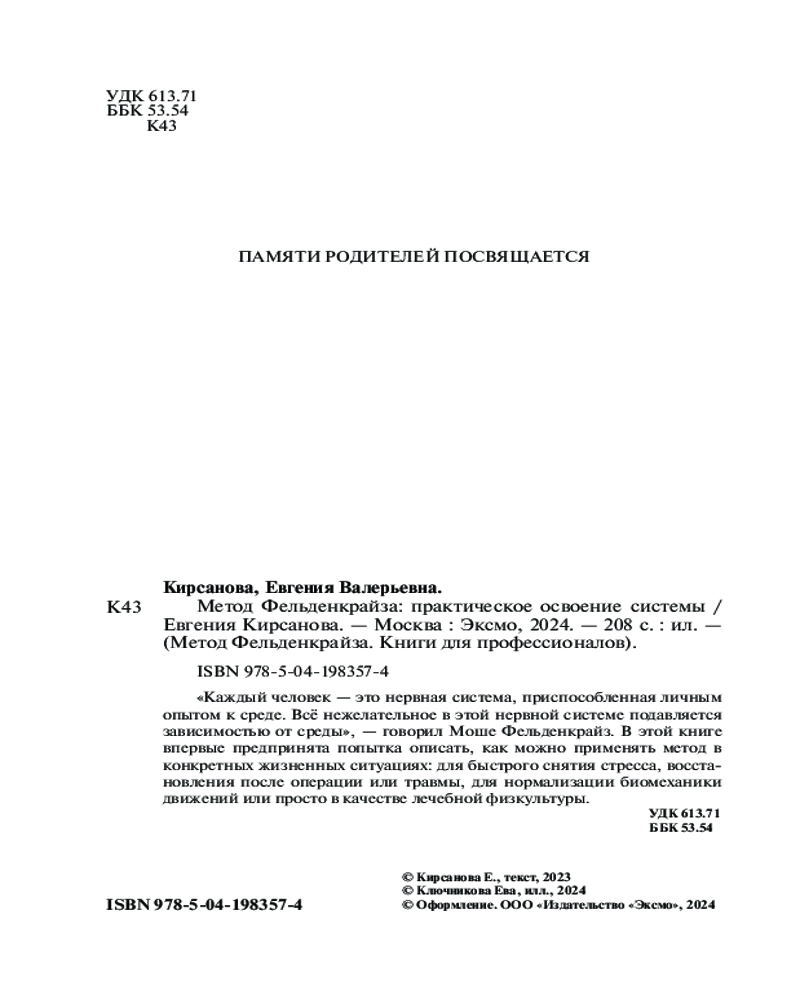 💳 Оплатить за товар можно при получении 🇰🇿 Есть бесплатная доставка по Казахстану от 1 дня 🎁 Копите бонусы с каждой покупки Серия: Метод Фельденкрайза. Книги для профессионалов Автор, ученица школы Фельденкрайза, рассказывает, как возможно применить Метод Фельденкрайза на практике и добиться улучшения эмоционального, когнитивного, физического качества жизни, достигаемого за счёт раскрытия человеком своего врождённого потенциала. Метод может также применяться как телесно-ориентированная психотерапия или форма физической реабилитации при различных травмах, последствиях инсультов и других физических недомоганиях. |
