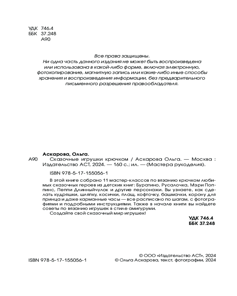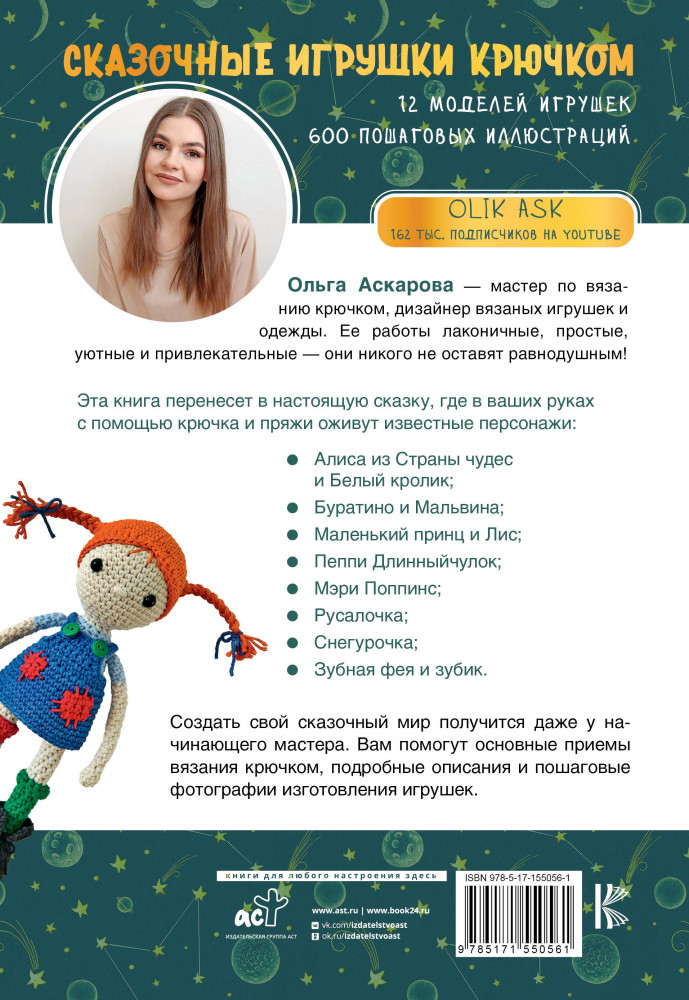 💳 Оплатить за товар можно при получении 🇰🇿 Есть бесплатная доставка по Казахстану от 1 дня 🎁 Копите бонусы с каждой покупки Серия: Мастера рукоделия Ольга Аскарова — мастер по вязанию крючком, дизайнер вязаных игрушек и одежды. Ее работы лаконичные, простые, уютные и привлекательные — они никого не оставят равнодушным! |