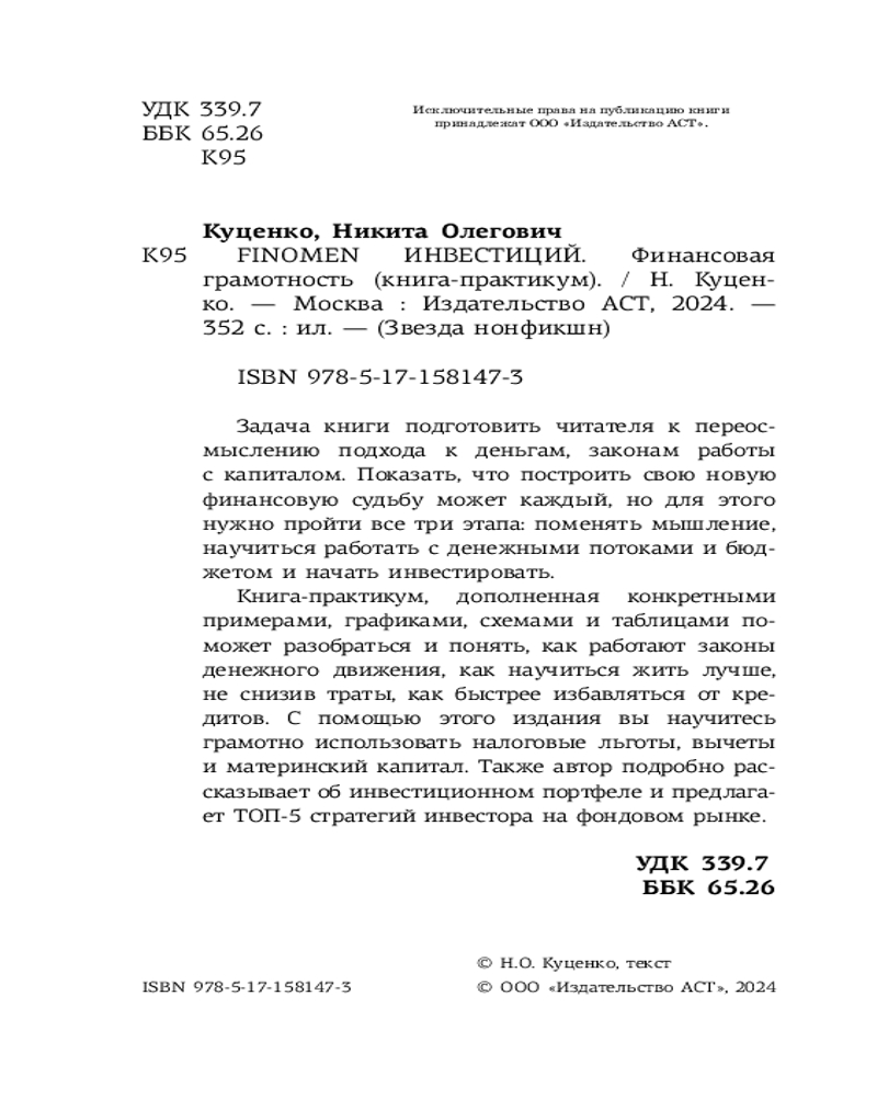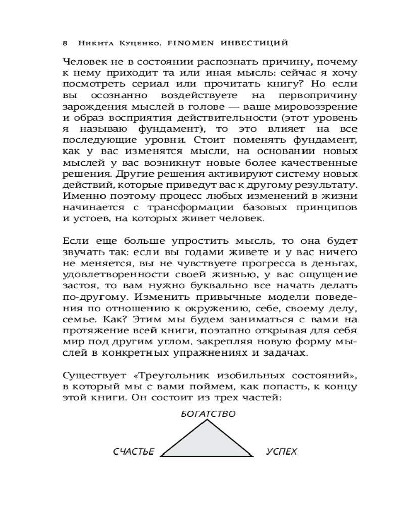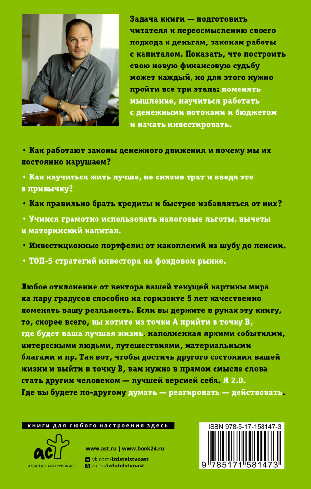 Серия: Звезда нонфикшн Задача книги подготовить читателя к переосмыслению своего подхода к деньгам, законам работы с капиталом. Показать, что построить свою новую финансовую судьбу может каждый, но для этого нужно пройти все три этапа: поменять мышление, научиться работать с денежными потоками и бюджетом и начать инвестировать.