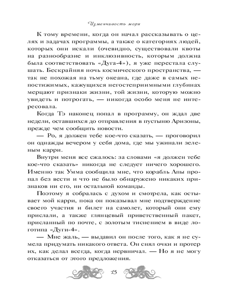 Серия: Шепот ветра Ро в кризисе. Она не может найти общий язык с матерью, ее парень расстался с ней, чтобы присоединиться к миссии на Марс. Дни она проводит на работе в океанариуме, где на нее скидывают всю грязную работу, а ночью пьет, чтобы забыться. Лучшая подруга занята подготовкой к свадьбе, а единственный человек, который ее понимал — отец, — пропал без вести много лет назад... Единственное, что дает ей стабильность в этом хаосе, — это гигантский тихоокеанский осьминог Долорес. Вот только богатый инвестор хочет выкупить осьминога, а Ро точно не сможет противостоять неизбежному, оказавшись на грани саморазрушения. И ей придется решить: плыть ли ей и дальше по течению, качаясь на волнах жизни, или не побояться и нырнуть с головой в неукротимый поток, позволив морю — и миру вокруг — меняться... |