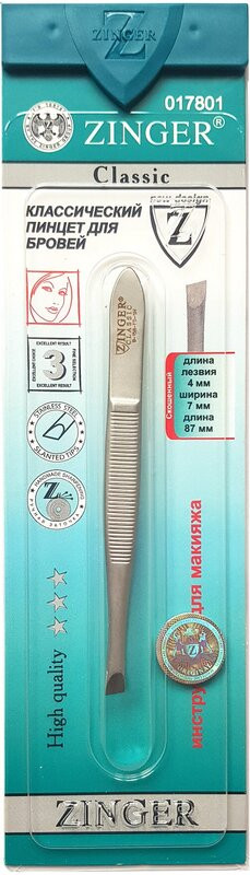 Пинцет для бровей Zinger 158. Превосходный инструмент для коррекции формы бровей. Скошенный угол заточки для удобства пользования. Мягкий равномерный пружинящий ход. Пинцет изготовлен из высококачественной нержавеющей гипоаллергенной стали.