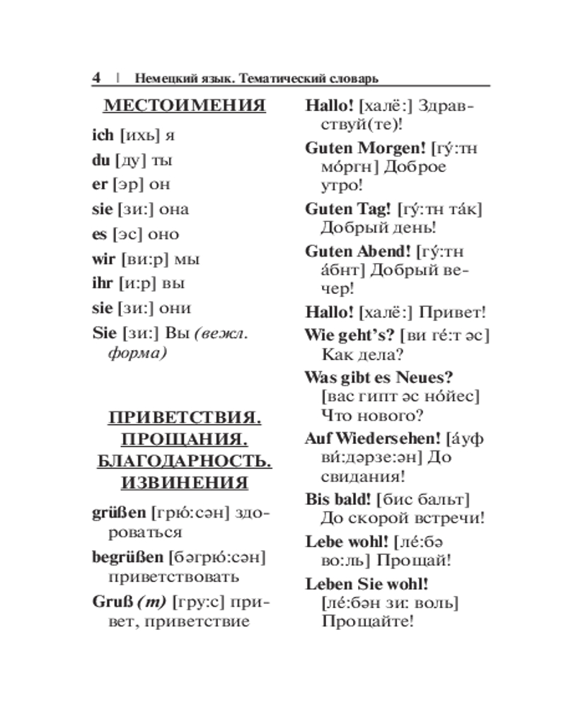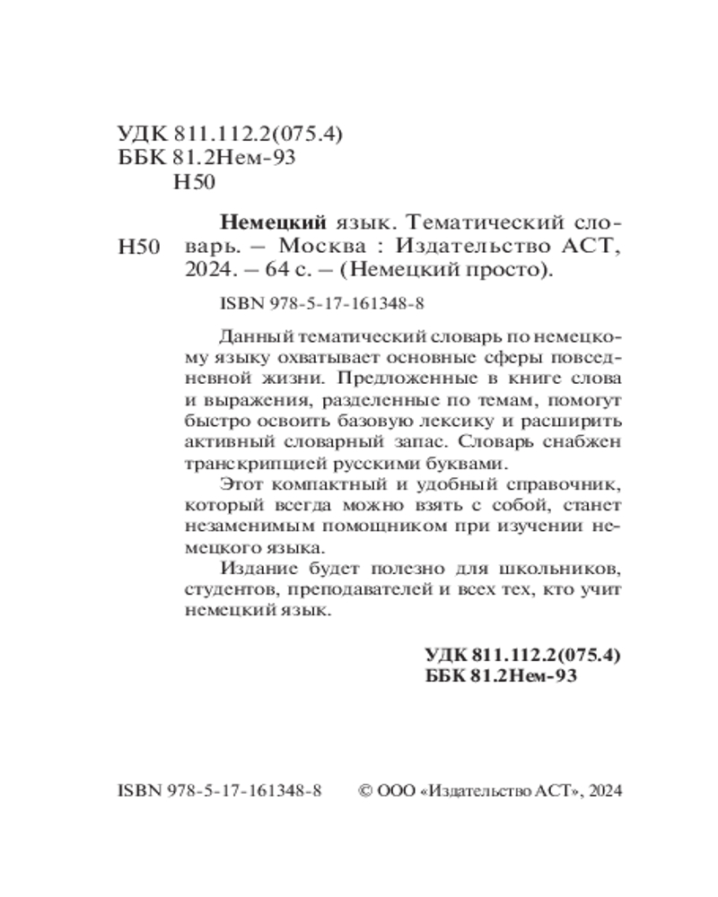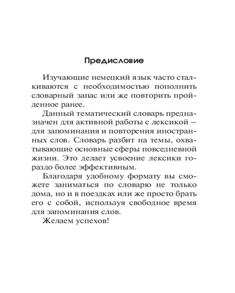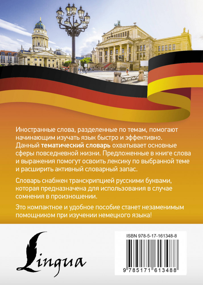 Немецкий язык. Тематический словарьудобный справочник небольшой формат быстрый поиск тонкий практичный В данный момент этот товар отсутствует в продаже. Возможно, у нас найдется аналогичный или похожий товар здесь. Серия: Немецкий просто Данный тематический словарь по немецкому языку охватывает основные сферы повседневной жизни. Предложенные в книге слова и выражения, разделенные по темам, помогут быстро освоить базовую лексику и расширить активный словарный запас. Словарь снабжен транскрипцией русскими буквами. Этот компактный и удобный справочник, который всегда можно взять с собой, станет незаменимым помощником при изучении немецкого языка. Издание будет полезно для школьников, студентов, преподавателей и всех тех, кто учит немецкий язык. |