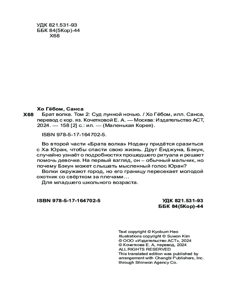 Серия: Маленькая Корея Во второй части «Брата волка» Нодану придётся сразиться с Ха Юран, чтобы спасти свою жизнь. Друг Ёнджуна, Бэкун, случайно узнаёт о подробностях прошедшего ритуала и решает помочь девочке. На первый взгляд, он — обычный мальчик, но почему Бэкун может слышать мысленный голос Юран? Волки окружают город, но его границу пересекает молодой охотник со свёртком за плечами... |