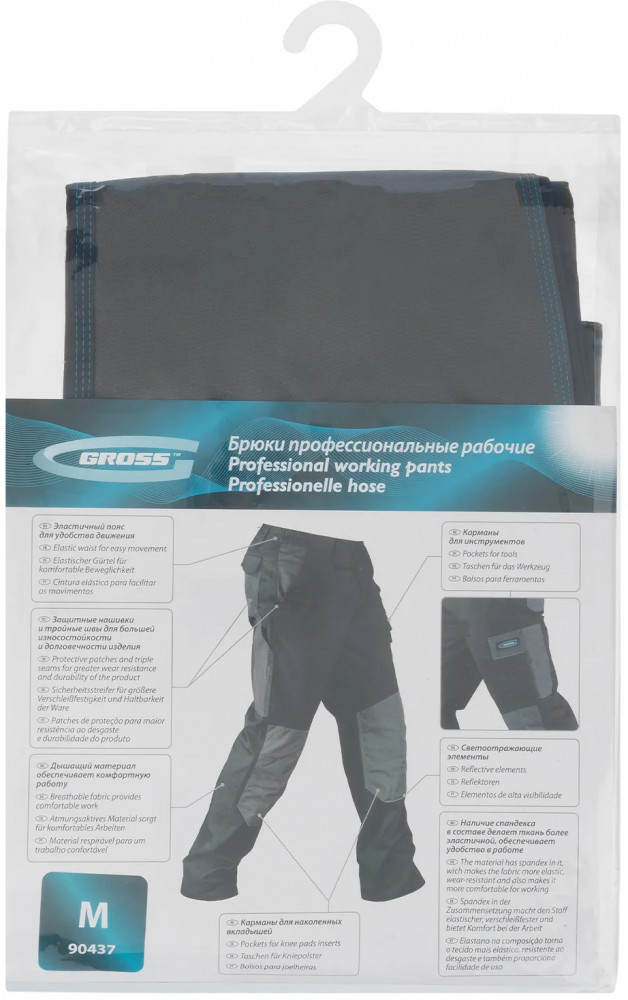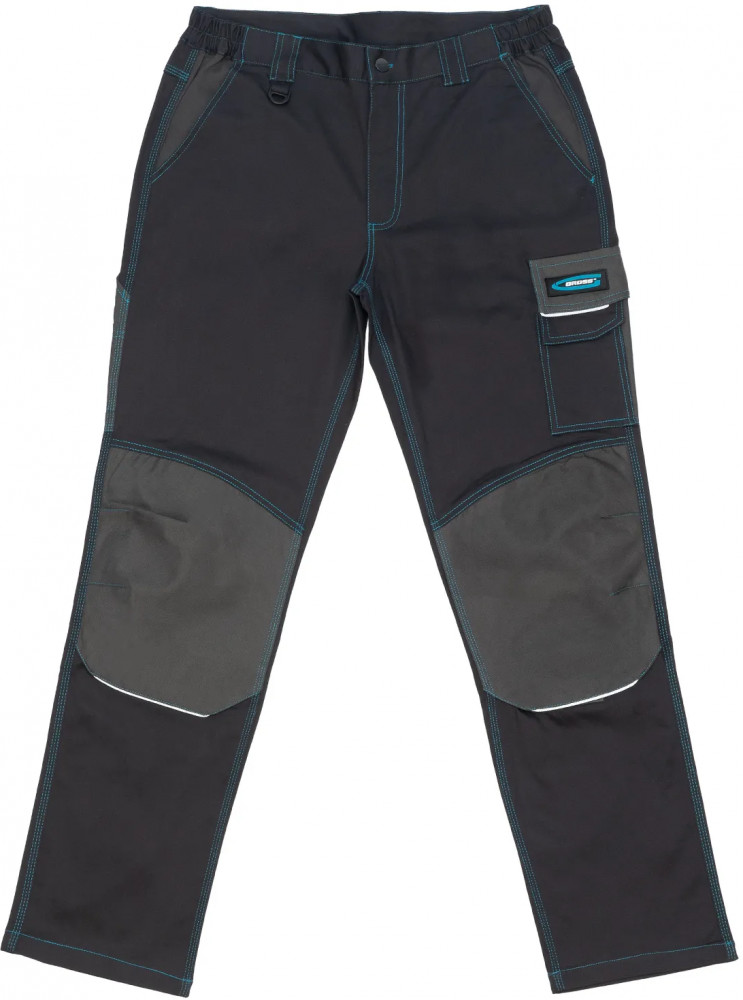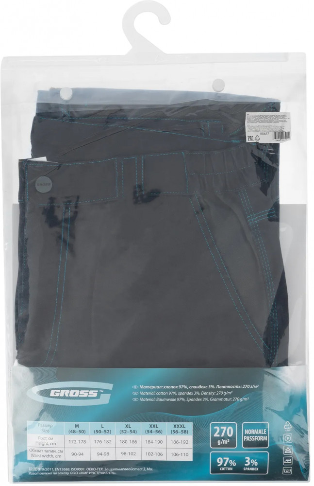 Профессиональные рабочие брюки Gross рассчитаны на рост 172-178 см и защищают пользователя от общих производственных загрязнений, нетоксичной пыли, ветра и незначительных механических воздействий. Подойдут для выполнения различных видов работ в теплое время года или в отапливаемом помещении. Выполнены в практичном темно-сером цвете. Изготовлены из ткани с 97-процентным содержанием хлопка и 3-процентным содержанием спандекса. За счет наличия хлопковых волокон в составе ткань прекрасно пропускает воздух и приятна на теле, а спандекс делает ее более эластичной, поэтому в брюках удобно работать.