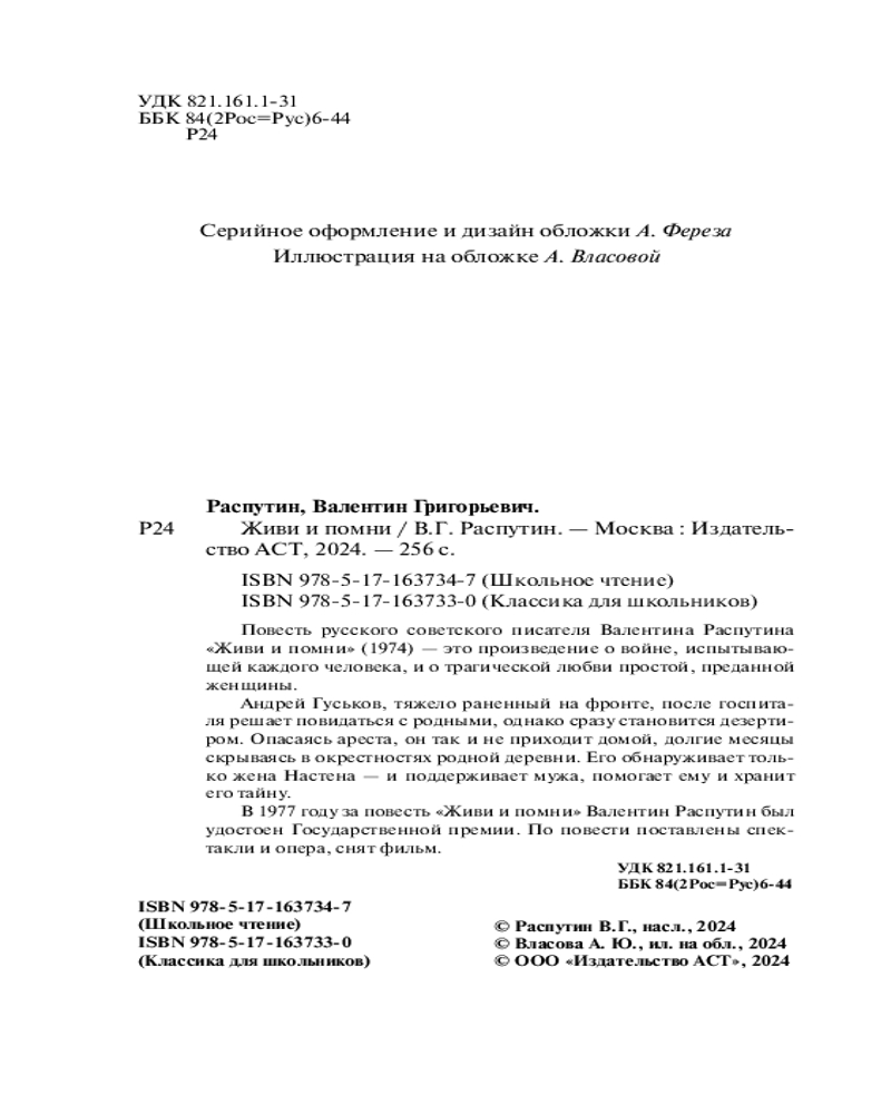 💳 Оплатить за товар можно при получении 🇰🇿 Есть бесплатная доставка по Казахстану от 1 дня 🎁 Копите бонусы с каждой покупки Серия: Классика для школьников Повесть русского советского писателя Валентина Распутина «Живи и помни» (1974) — это произведение о войне, испытывающей каждого человека, и о трагической любви простой, преданной женщины. |