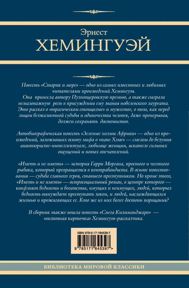 | Старик и море. Зеленые холмы Африки. Снега Килиманджаро. Иметь и не иметь Эрнест Миллер Хемингуэй