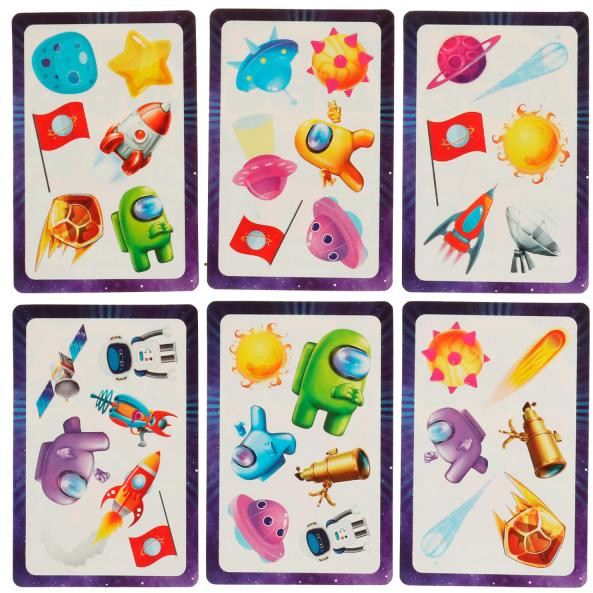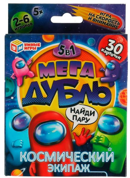 Карточная игра 5 в 1 «Мега Дубль. Найди пару. Космический экипаж» — отличный вариант для весёлого и интересного времяпровождения. Эта динамичная игра-соревнование на скорость и внимание надолго увлечёт маленьких любознаек. Можно выбрать любую игру из предложенных пяти вариантов, суть их всех сводится к одному — отыскать быстрее всех картинку-совпадение на своей карточке и карточке, указанной в правилах той или иной вариации игры.