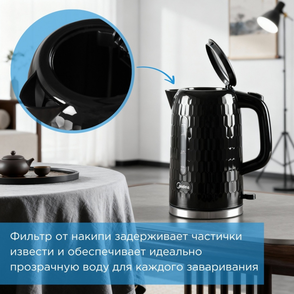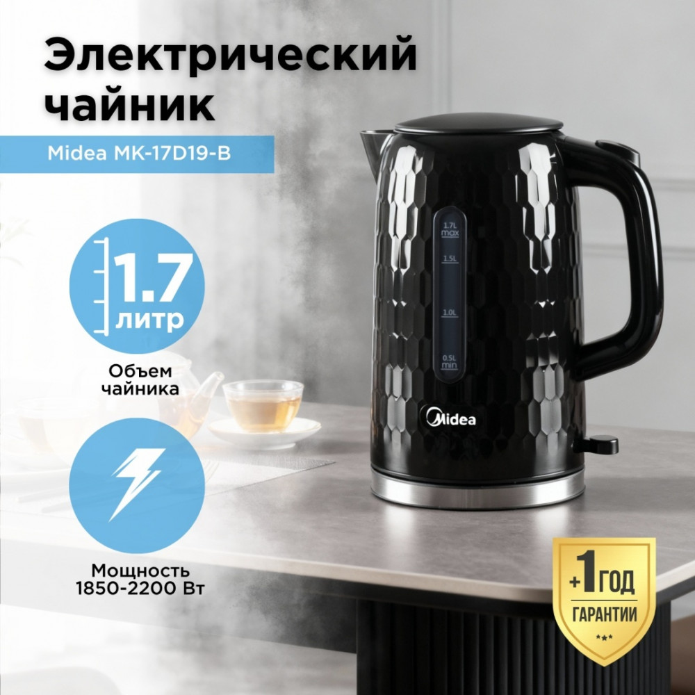 Стильный и удобный чайник Midea MK-17D19 Black — идеальное сочетание дизайна, мощности и безопасности. Благодаря объёму 1,7 литра вы сможете быстро вскипятить воду для всей семьи, а мощность до 2200 Вт обеспечивает молниеносный нагрев.