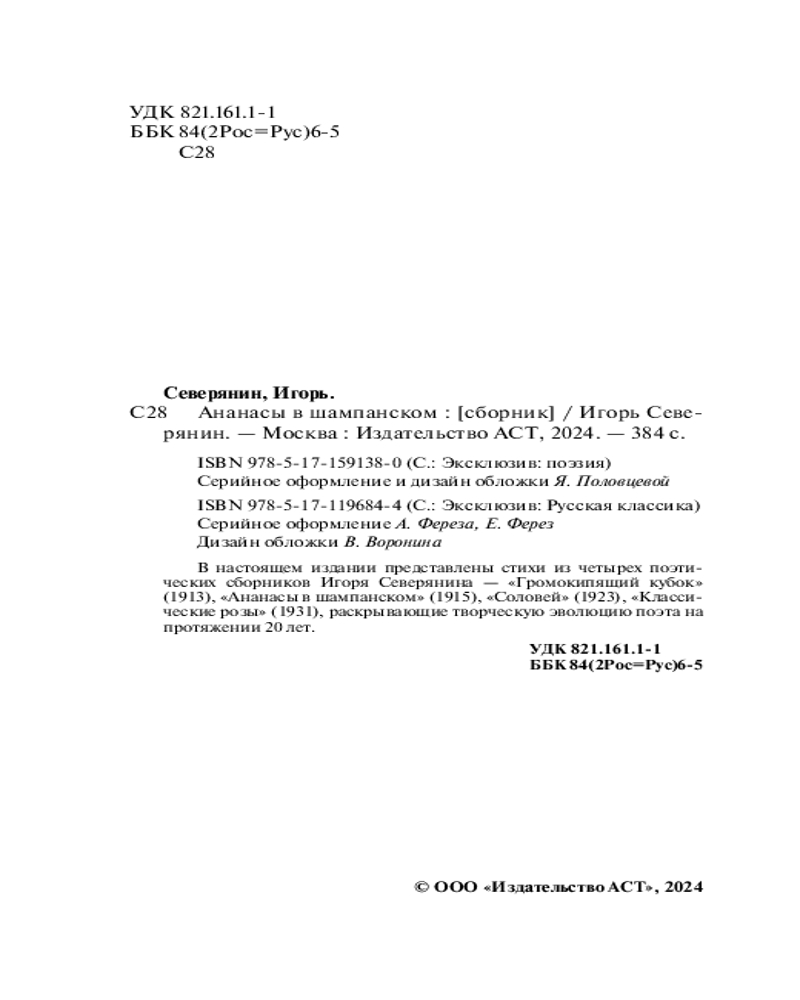 Ананасы в шампанскомВ данный момент этот товар отсутствует в продаже. Возможно, у нас найдется аналогичный или похожий товар здесь. Серия: Эксклюзив: поэзия В настоящем издании представлены стихи из четырех поэтических сборников Игоря Северянина — «Громокипящий кубок» (1913), «Ананасы в шампанском» (1915), «Соловей» (1923), «Классические розы» (1931), раскрывающие творческую эволюцию поэта на протяжении 20 лет. |