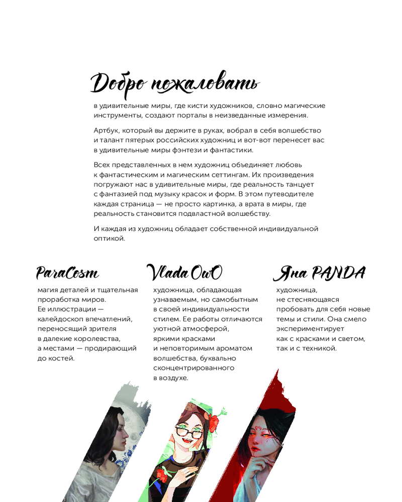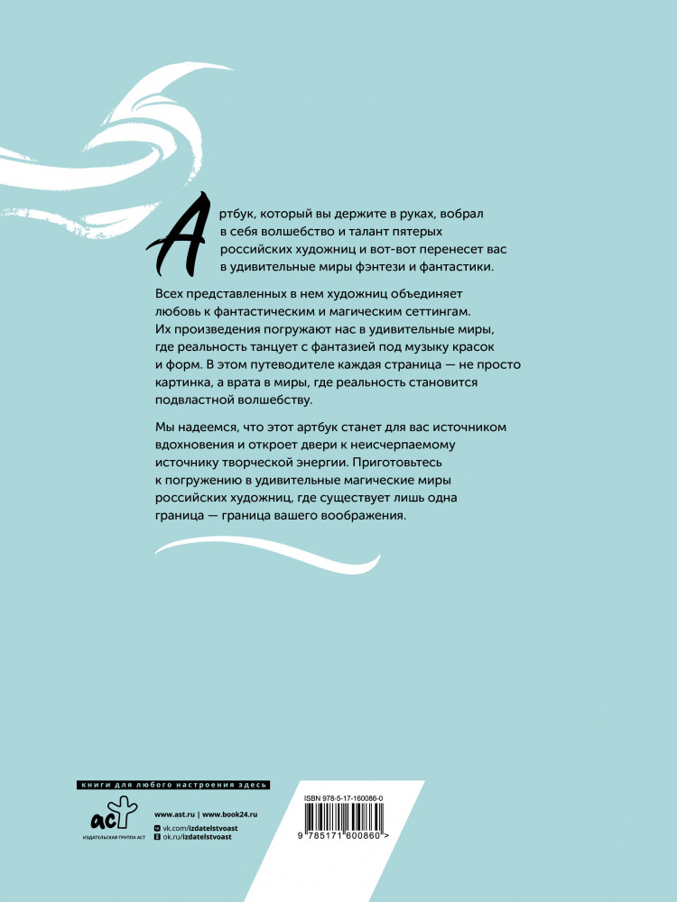 Мы надеемся, что этот артбук станет для вас источником вдохновения и откроет двери к неисчерпаемому источнику творческой энергии. Приготовьтесь к погружению в удивительные магические миры российских художниц, где существует лишь одна граница — граница вашего воображения. |