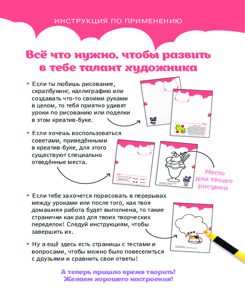 💳 Оплатить за товар можно при получении 🇰🇿 Есть бесплатная доставка по Казахстану от 1 дня 🎁 Копите бонусы с каждой покупки Серия: Только между нами Перед тобой не просто дневничок! Это креативное пространство, подсказывающее kawaii идеи творчества и поделок. Планируй дела и параллельно учись рисовать милые арты, пройди весёлые тесты и просто весело проведи время за раскрашиванием! |