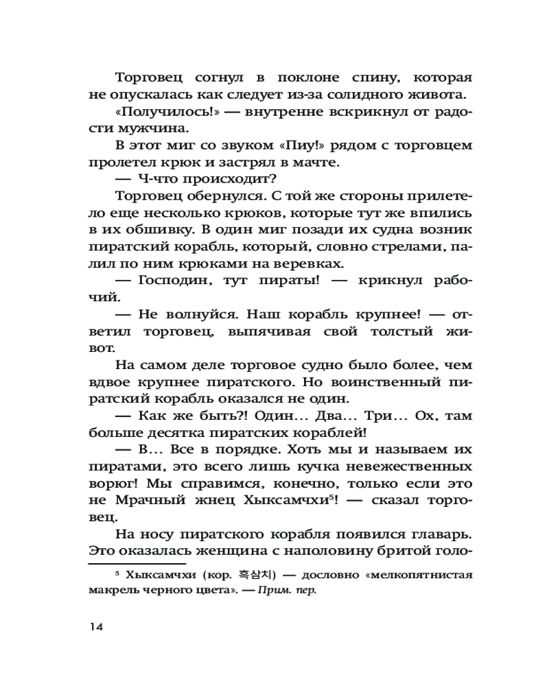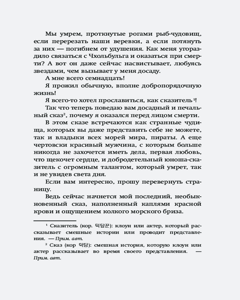 Серия: Истории о монстрах и пиратах государства Силла Серия книг «Существа» — это пираты, первая любовь, приключения и страшные чудовища. Главному герою — молодому сказителю Со Сосэну — патологически не везет: денег нет, и никто не считает его представления смешными. Несмотря на это он остается добрым человеком, и однажды это замечает прекрасная предводительница пиратов Корэнун, которая дарит пареньку золотое ожерелье. Однако Со Сосэну снова не везет, и его обманывает легендарный пират и мошенник по кличке Чхольбульга. Юноша намерен вернуть драгоценный подарок и стать знаменитым, но теперь из-за вранья Чхольбульга он из простого сказителя становится опаснейшим пиратом Восточного моря, который охотится за страшным великаном чанином... |