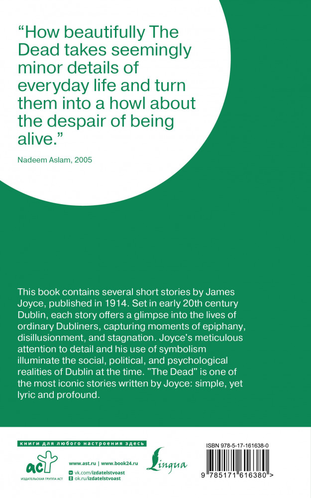 💳 Оплатить за товар можно при получении 🇰🇿 Есть бесплатная доставка по Казахстану от 1 дня 🎁 Копите бонусы с каждой покупки Серия: Lingua Moderna Джеймс Джойс (1882–1941) — ирландский писатель-модернист, сильно повлиявший на всю мировую литературу. В этот сборник вошли восемь рассказов Джойса, из сборника «The Dubliners»: «The Dead», «A Painful Case», «The Boarding House», «Araby», «Eveline», «The Sisters». Рассказы Дж. Джойса отличает реализм, схожий с лучшими рассказами А .П. Чехова. Рассказы публикуются на английском языке без сокращений и адаптации. |