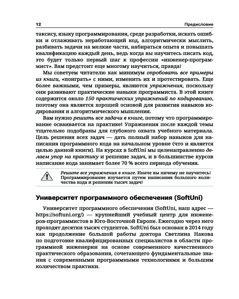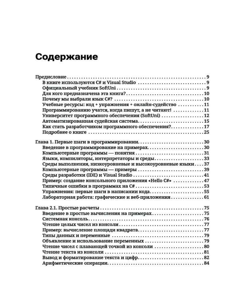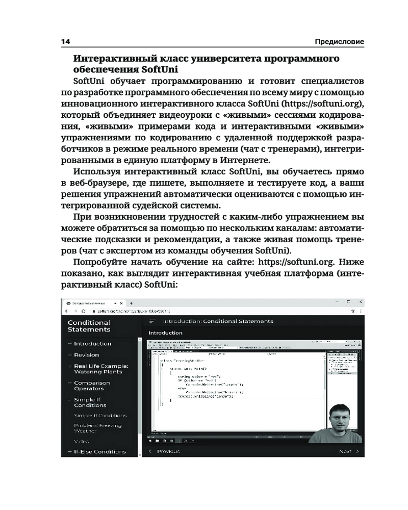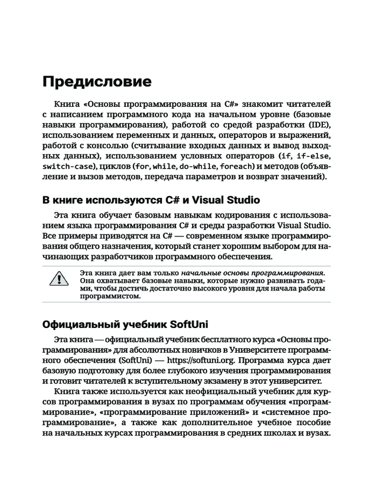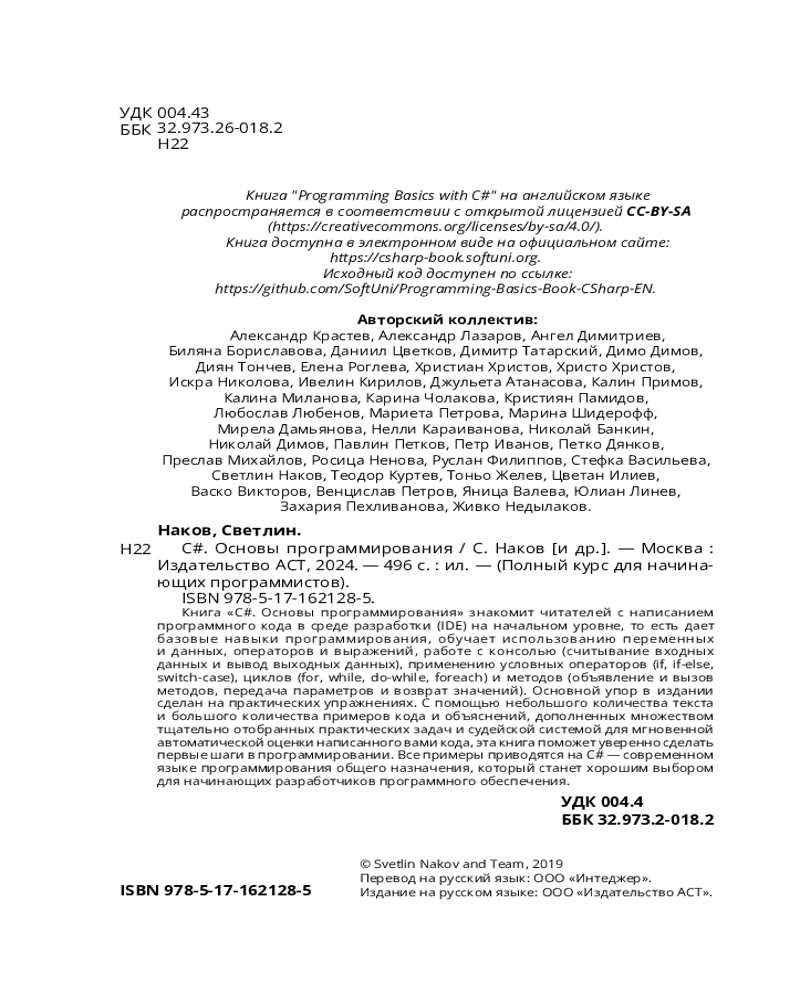 C#. Основы программированияВ данный момент этот товар отсутствует в продаже. Возможно, у нас найдется аналогичный или похожий товар здесь. Серия: Полный курс для начинающих программистов Книга «C#. Основы программирования» знакомит читателей с написанием программного кода в среде разработки (IDE) на начальном уровне, то есть дает базовые навыки программирования, обучает использованию переменных и данных, операторов и выражений, работе с консолью (считывание входных данных и вывод выходных данных), применению условных операторов (if, if-else, switch-case), циклов (for, while, do-while, foreach) и методов (объявление и вызов методов, передача параметров и возврат значений). Основной упор в издании сделан на практических упражнениях. С помощью небольшого количества текста и большого количества примеров кода и объяснений, дополненных множеством тщательно отобранных практических задач и судейской системой для мгновенной автоматической оценки написанного вами кода, эта книга поможет уверенно сделать первые шаги в программировании. Все примеры приводятся на C# — современном языке программирования общего назначения, который станет хорошим выбором для начинающих разработчиков программного обеспечения. |