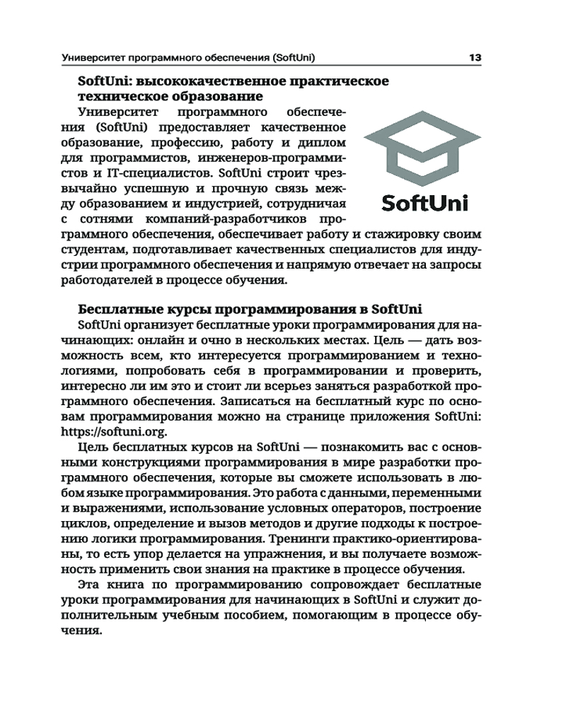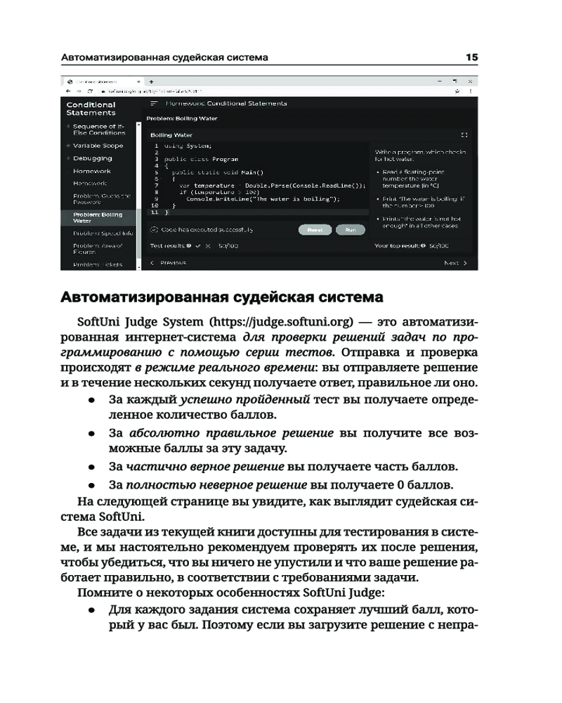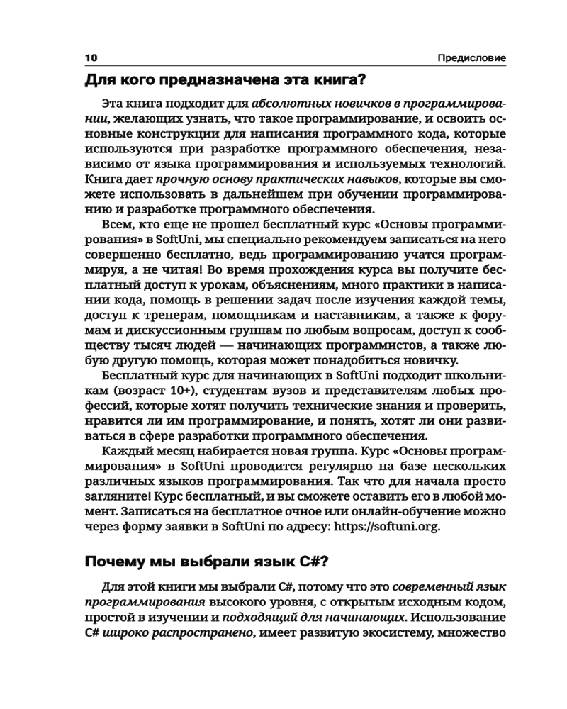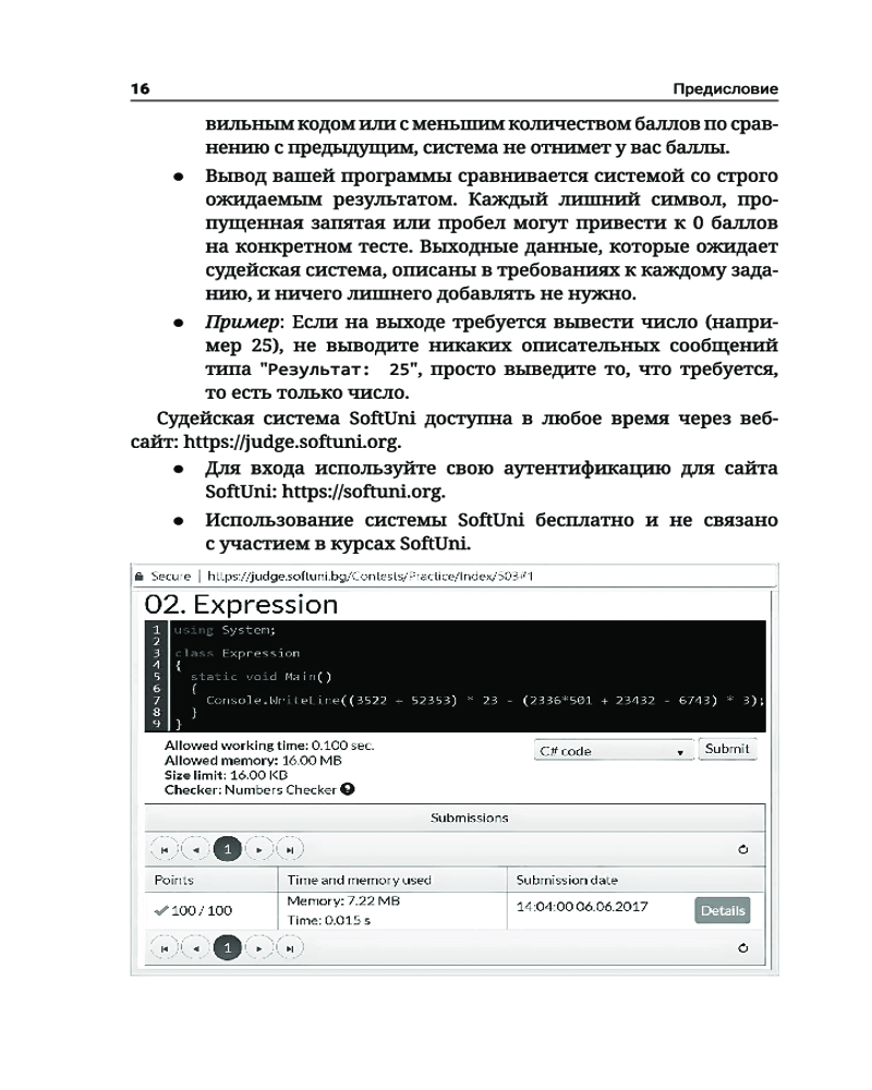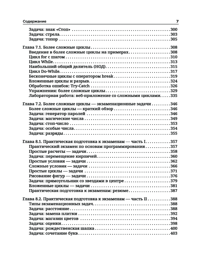 C#. Основы программированияВ данный момент этот товар отсутствует в продаже. Возможно, у нас найдется аналогичный или похожий товар здесь. Серия: Полный курс для начинающих программистов Книга «C#. Основы программирования» знакомит читателей с написанием программного кода в среде разработки (IDE) на начальном уровне, то есть дает базовые навыки программирования, обучает использованию переменных и данных, операторов и выражений, работе с консолью (считывание входных данных и вывод выходных данных), применению условных операторов (if, if-else, switch-case), циклов (for, while, do-while, foreach) и методов (объявление и вызов методов, передача параметров и возврат значений). Основной упор в издании сделан на практических упражнениях. С помощью небольшого количества текста и большого количества примеров кода и объяснений, дополненных множеством тщательно отобранных практических задач и судейской системой для мгновенной автоматической оценки написанного вами кода, эта книга поможет уверенно сделать первые шаги в программировании. Все примеры приводятся на C# — современном языке программирования общего назначения, который станет хорошим выбором для начинающих разработчиков программного обеспечения. |