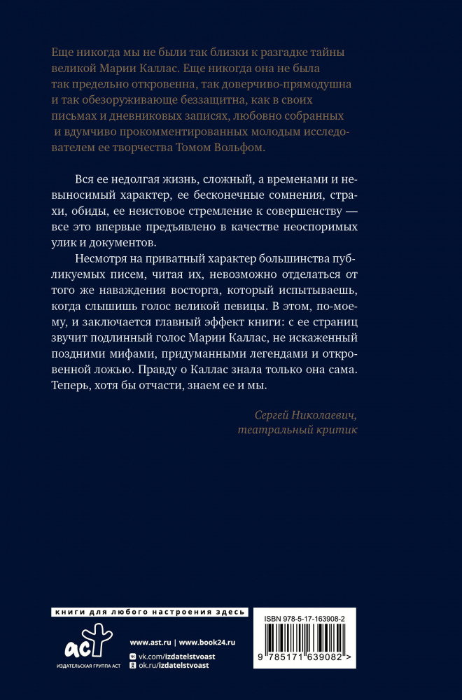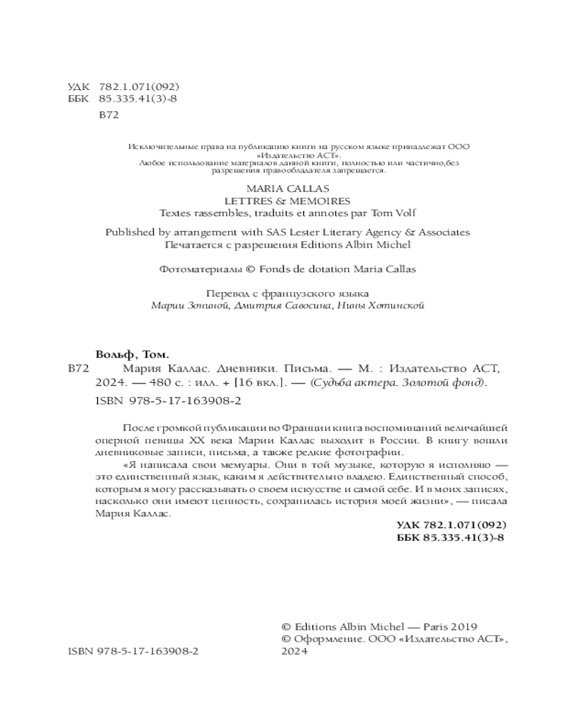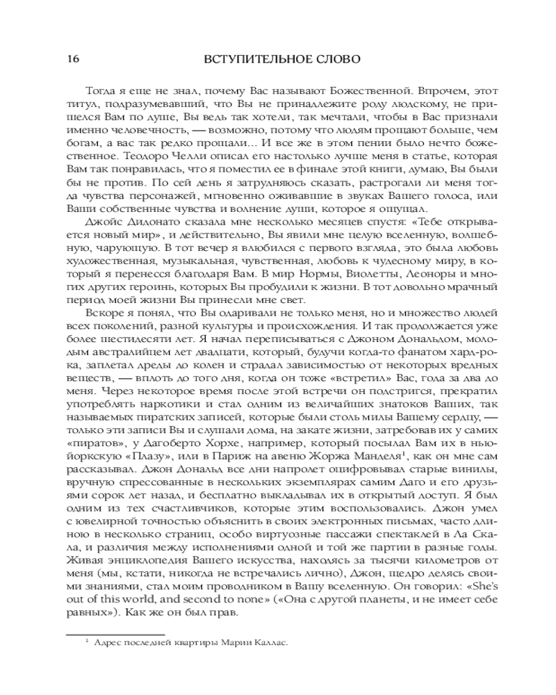 Серия: Большое искусство. Персоны и биографии После громкой публикации во Франции книга воспоминаний величайшей оперной певицы ХХ века Марии Каллас выходит в России. В книгу вошли дневниковые записи, письма, а также редкие фотографии. «Я написала свои мемуары. Они в той музыке, которую я исполняю — это единственный язык, каким я действительно владею. Единственный способ, которым я могу рассказывать о своем искусстве и самой себе. И в моих записях, насколько они имеют ценность, сохранилась история моей жизни», — писала Мария Каллас. |